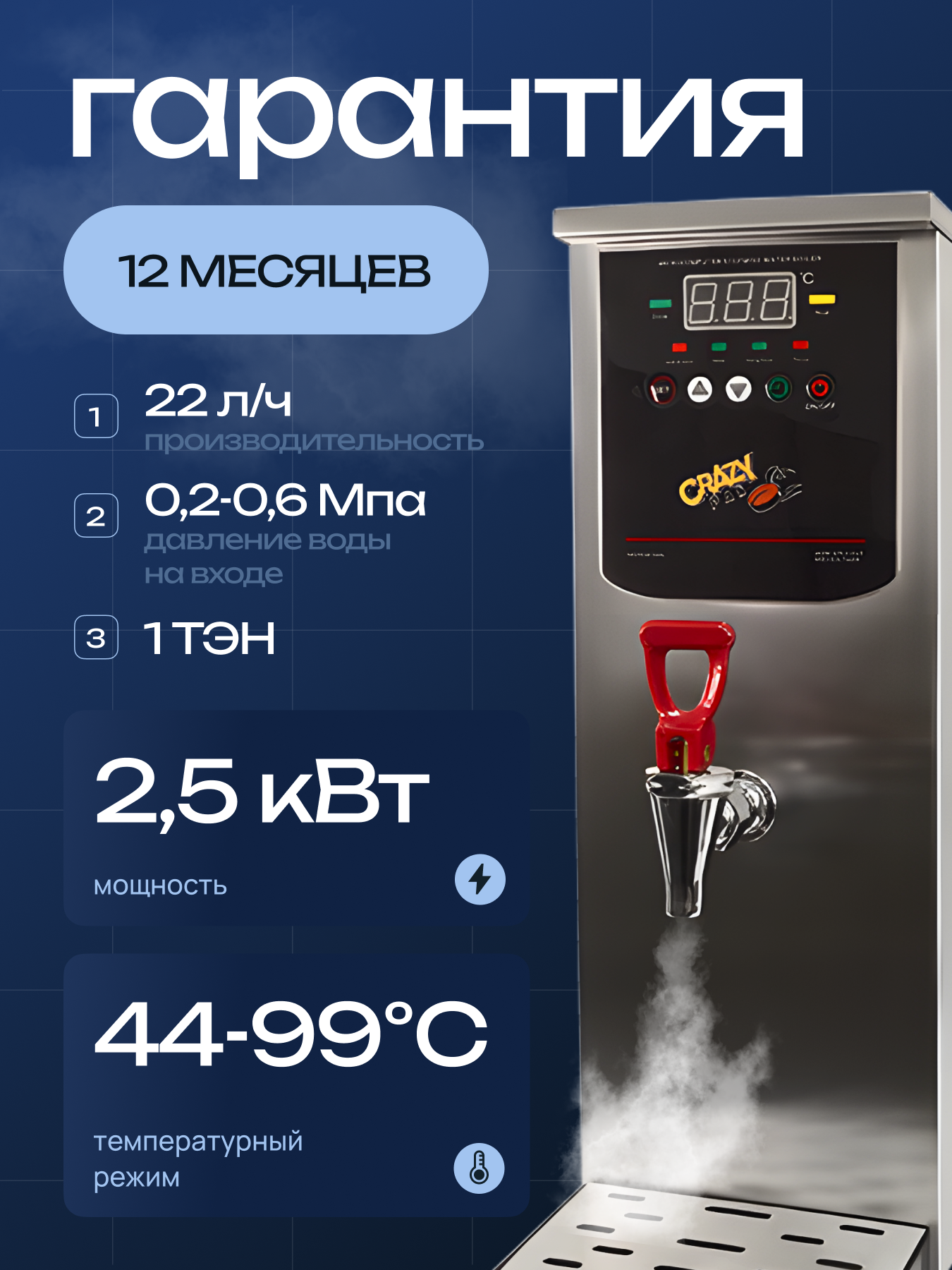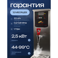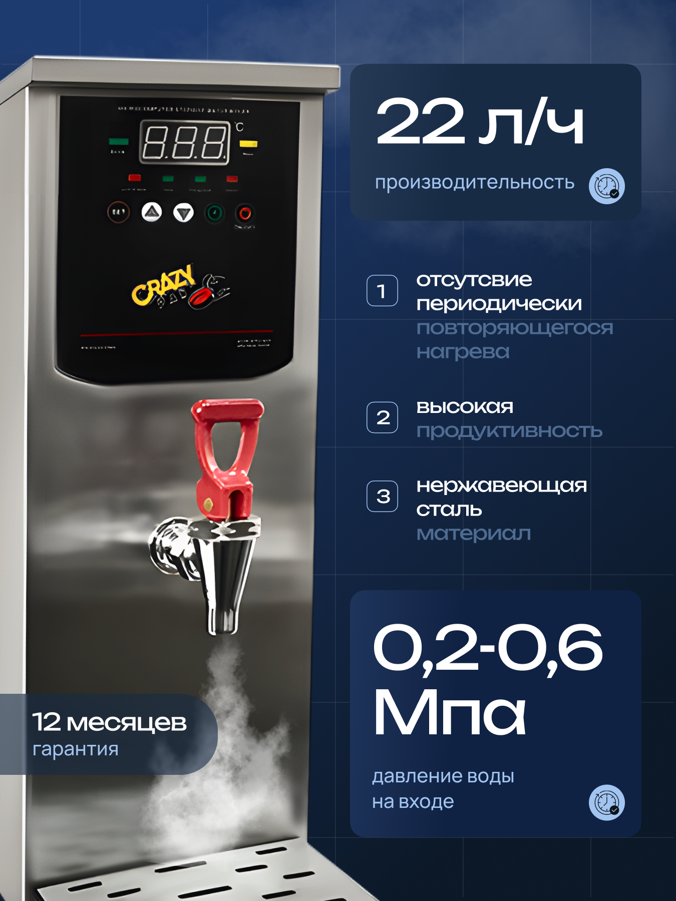 Электрокипятильник проточный Crazy Pan CP-IB22, 2,5 кВт, 22л/ч, таймер, объем бойлера 8 литров, серебро