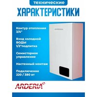| Дополнительная информация | Возможность подключения трёхходового клапана для бойлера косвенного нагрева Использование симисторного управления мощностью электрического котла Алгоритмы работы, обеспечивающие плавность изменения нагрузки на электрическую сеть Возможность ограничения максимальной мощности Возможность точной регулировки температуры |