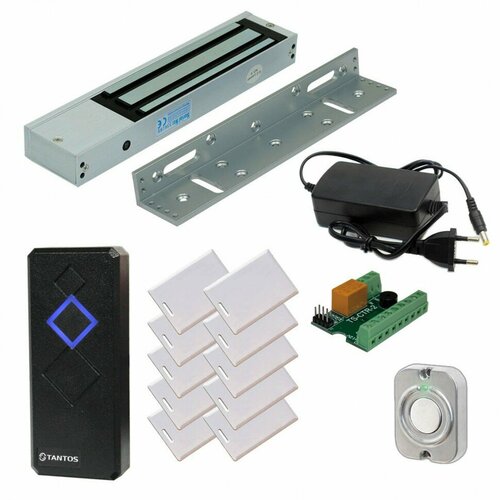 Состав комплекта: электромагнитный замок, 2 варианта крепления (на планку, на уголок), считыватель, контроллер с монтажной коробкой, 10 ключей-карт, металлическая накладная кнопка выхода, блок питания 12 В.
