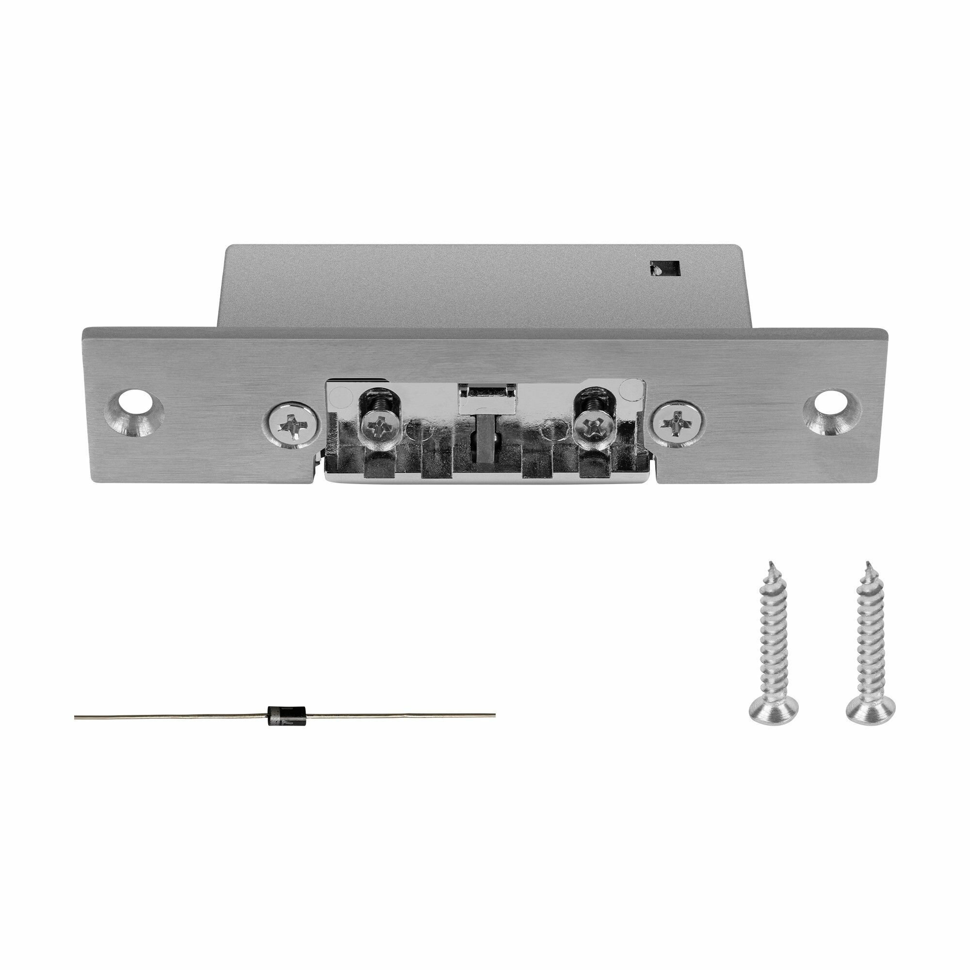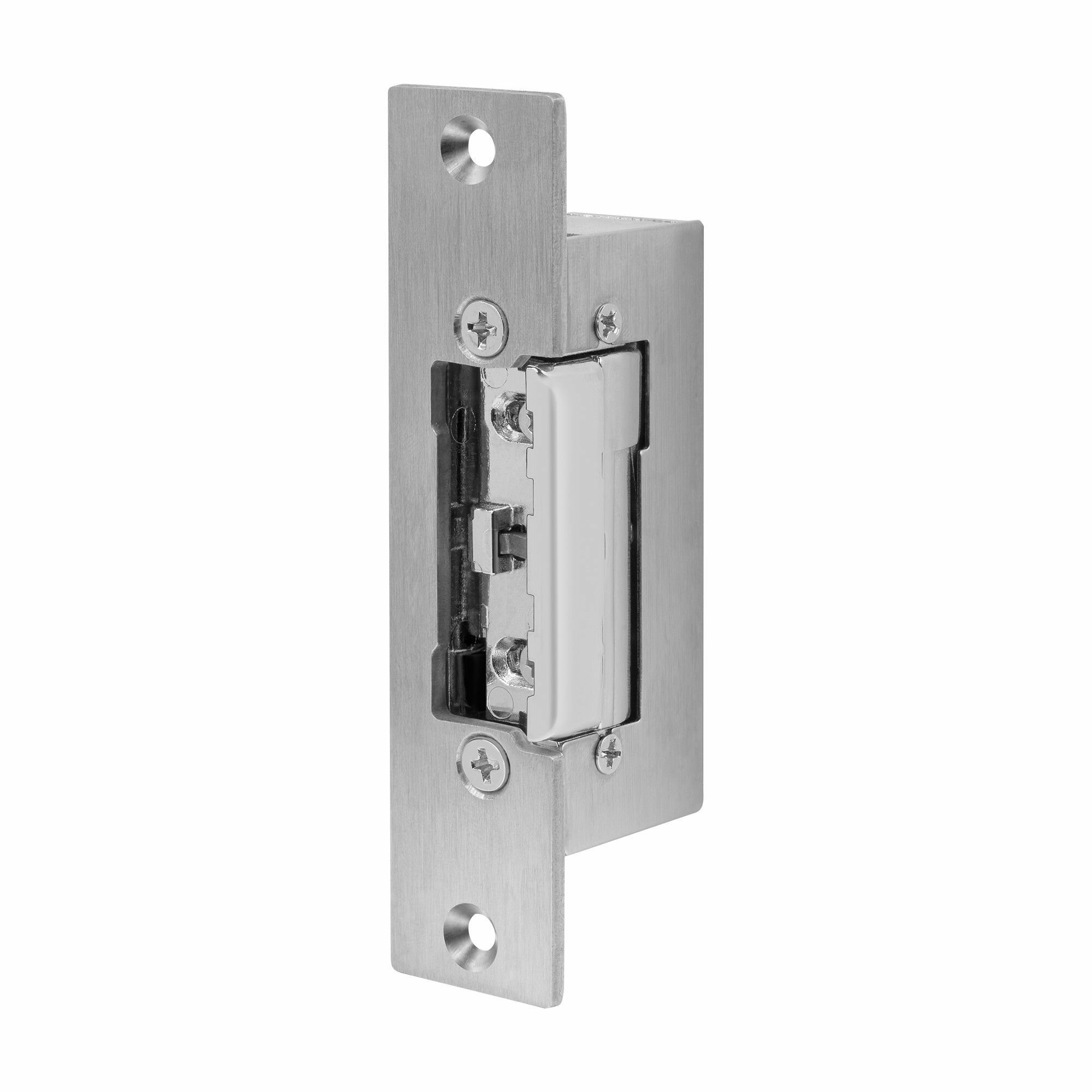 Электромеханическая защёлка Novicam DL1SP NO предназначена для запирания дверей под управлением контроллера СКУД, домофона или кодовой панели. Защёлка Novicam DL1SP NO врезается в дверную коробку и крепится с помощью короткой планки для использования совместно с косым ригелем механического замка. Благодаря врезному монтажу электромеханическая защелка не нарушает дизайн дверной коробки и подходит как для правых, так и для левых дверей. Данная защёлка является нормально-открытой и разблокируется при отключении питания. Запирающая часть защёлки имеет возможность регулировки, которая позволяет изменять её положение относительно ригеля механического замка. Корпус защёлки и планка изготовлены из нержавеющей стали, а запирающий механизм выполнен из цинка.