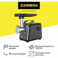 Электромясорубка Carrera № 454 с двигателем мощностью 1900 Вт способна за минуту переработать до 2,5 кг продуктов. Функция реверса дает возможность не прерываться в процессе готовки, чтобы вынуть намотавшиеся жилы.