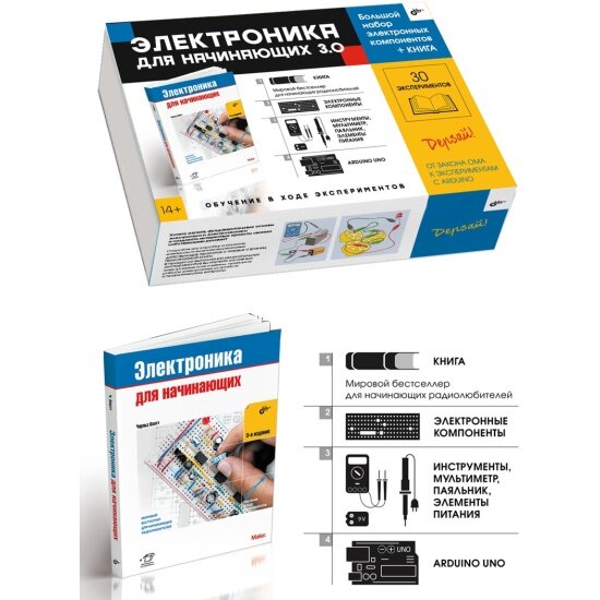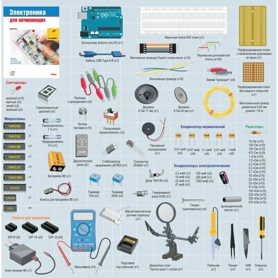 В состав набора входит цветная книга Чарльза Платта «Электроника для начинающих» (3 изд.), более 350 электронных компонентов от резисторов и конденсаторов до транзисторов, интегральных микросхем и микроконтроллера (платы Arduino Uno). Кроме того, в состав набора входят инструменты для создания электронных устройств (паяльник, держатель проводов третья рука”, нож, пинцет), элементы и блок питания и мультиметр.