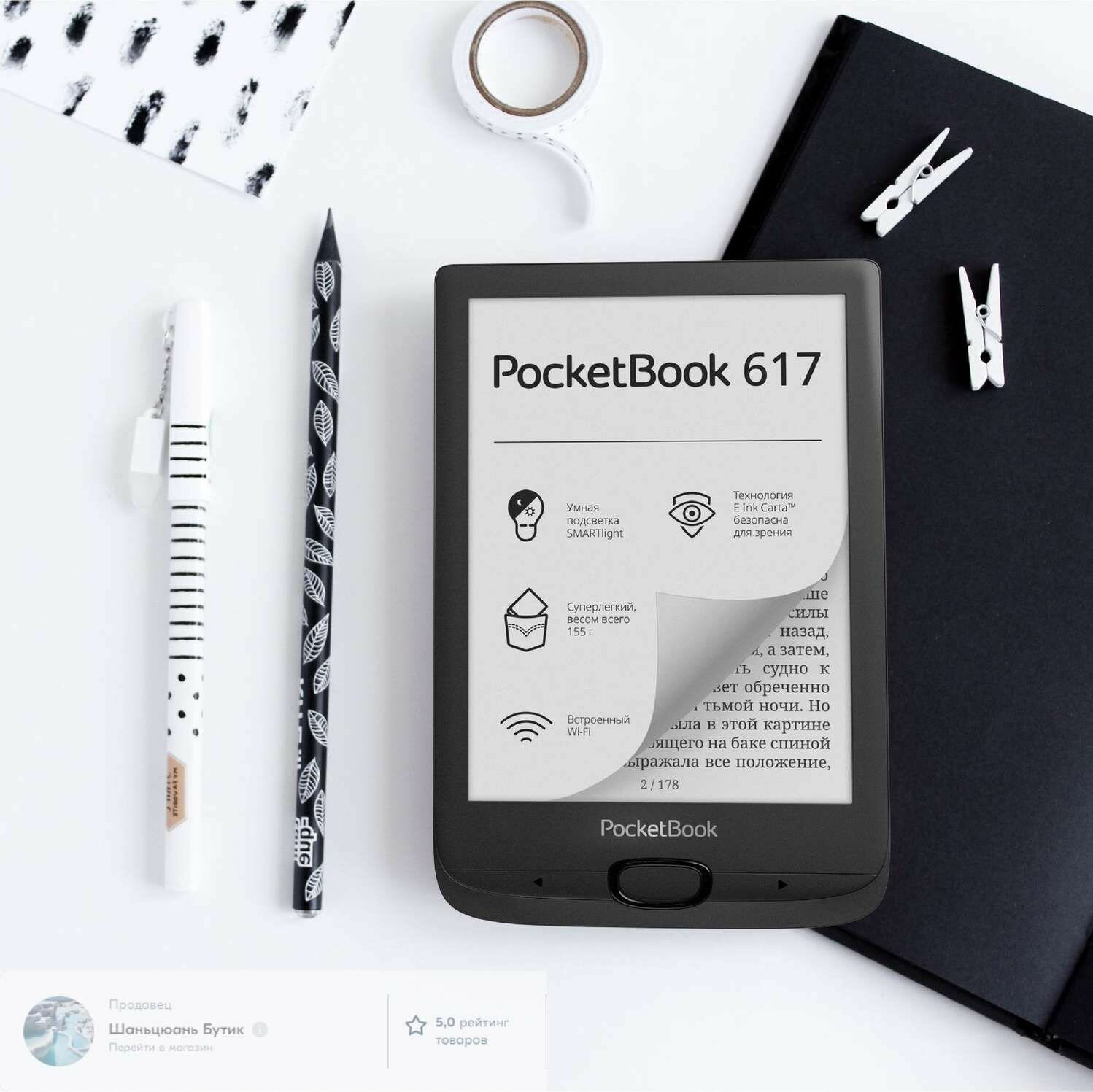 Электронная книга PocketBook 617 управляется при помощи кнопок, поэтому ее можно отнести к разряду классических моделей. Ее экран, изготовленный по технологии E-Ink Carta, не имеет сенсора. При этом устройство наделено целым набором флагманских технологий – например, оно имеет доступ к Wi-Fi и поддерживает сервис обмена книгами PocketBook Cloud. В основе функционирования модели – двухъядерный процессор и сразу 8 ГБ встроенной памяти. За счет этого быстро перелистываются страницы, открывается меню и запускаются приложения. Дополнительное достоинство электронной книги PocketBook 617 заключается в наличии регулируемой по температуре подсветки. Она создает комфортное освещение для чтения и расслабляет зрительный аппарат, что особенно актуально перед сном. Все характеристики модели говорят о том, что она создана для любителей классики, которым необходимы актуальные и идущие в ногу со временем технологии.