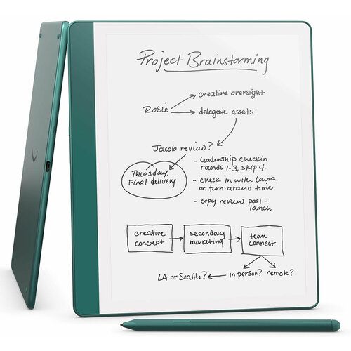 Благодаря отличному разрешению 300 ppi и адаптивной «тёплой» подсветке, дисплей Kindle Scribe выглядит так же, как лист качественной белоснежной бумаги. Внутренней памяти объемом 64 Гб хватит, чтобы загрузить на устройство огромную библиотеку электронных текстов. Amazon Kindle Scribe создан не только для чтения, но и для работы с документами. 1 ГБ оперативной памяти и процессор с тактовой частотой 1 ГГц обеспечивают высокую скорость работы. При помощи фирменного стилуса, можно рисовать, оставлять заметки и комментарии. Записи автоматически сохраняются, упорядочиваются и могут быть экспортированы по электронной почте.
