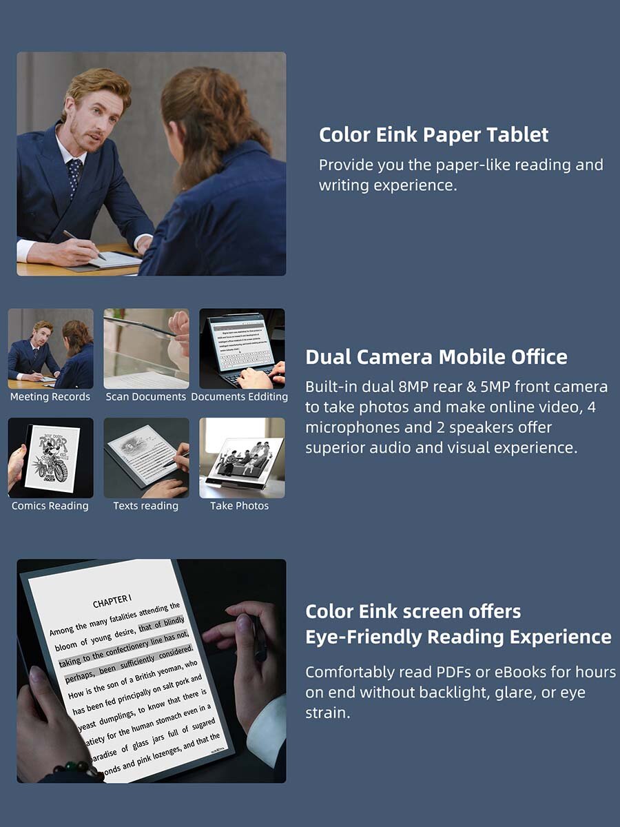 10,3-дюймовый экран E ink | Двойная камера | 2,3 ГГц восьмиядерный процессор | 6 ГБ ОЗУ 128 ГБ ПЗУ | 36-уровневая двойная фронтальная подсветка | Голосовая связь/запись текста | Открытый Android 11 | Интеллектуальный стилус A5 с беспроводной зарядкой | Поддержка G/o/o/g/l/e P/l/a/y.
