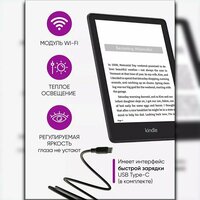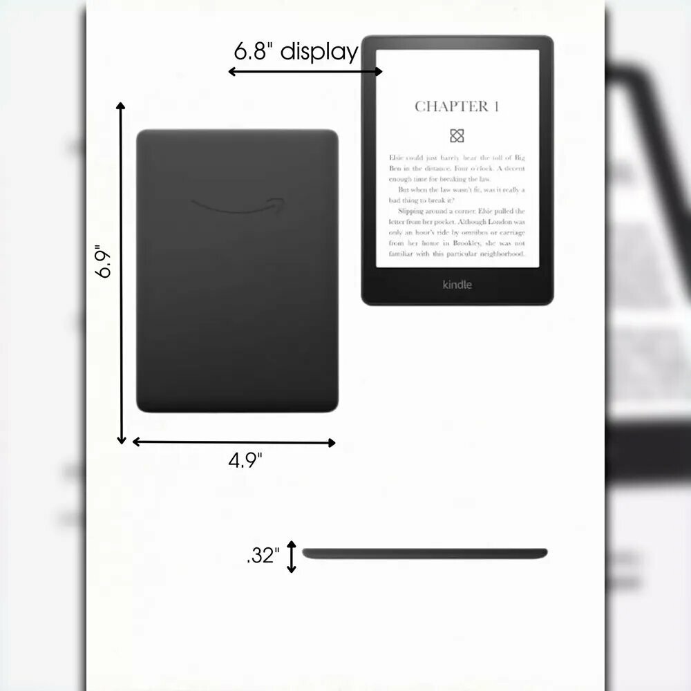 Демонстрируем технологию Amazon Display 6,8-дюймовый Paperwhite, встроенная подсветка, разрешение 300 точек на дюйм, оптимизированная технология шрифтов, 16 уровней оттенков серого. Размеры: 6,9 x 4,9 x 0,32 дюйма (174 x 125 x 8,1 мм). Вес: 7,3 унции (208 г). Фактические размеры и вес могут отличаться в зависимости от конфигурации и производственных процессов. Полностью беспроводное подключение, для загрузки контента не требуется компьютер. Память устройства 8 ГБ; Срок службы батареи. До десяти (10) недель работы от батареи без подзарядки при получасе чтения в день (беспроводная связь отключена и индикатор установлен на 13). . Срок службы батареи может варьироваться в зависимости от использования. Воспроизведение аудиокниг через Bluetooth сокращает время автономной работы. Wi-Fi поддерживает сети 2,4 ГГц и 5,0 ГГц. Не поддерживается подключение к одноранговым (или одноранговым) сетям Wi-Fi. Форматы контента. Поддерживаемые форматы: Kindle 8 (AZW3), Kindle (AZW), TXT, PDF, незащищенный MOBI, родной китайский HTML, DOC; DOCX, JPEG, GIF, PNG, PMP через преобразование аудиоформата (AAX). Водонепроницаемый и водонепроницаемый (IPX8), протестирован на погружение в пресную воду на глубину 2 метра на 60 минут.