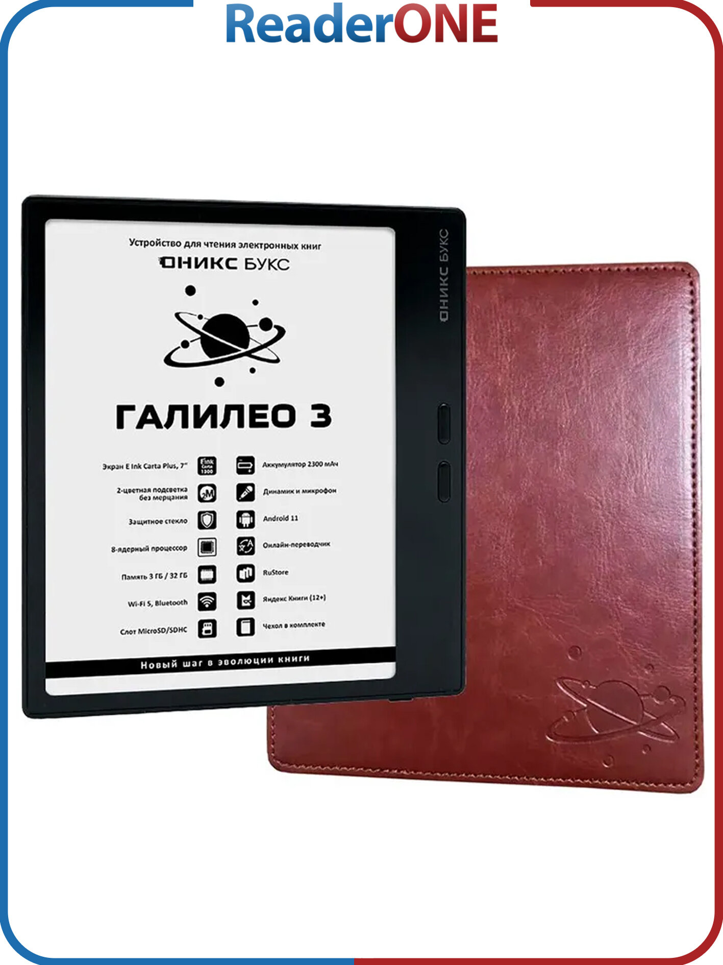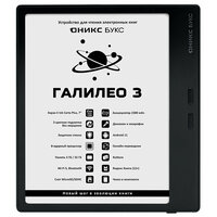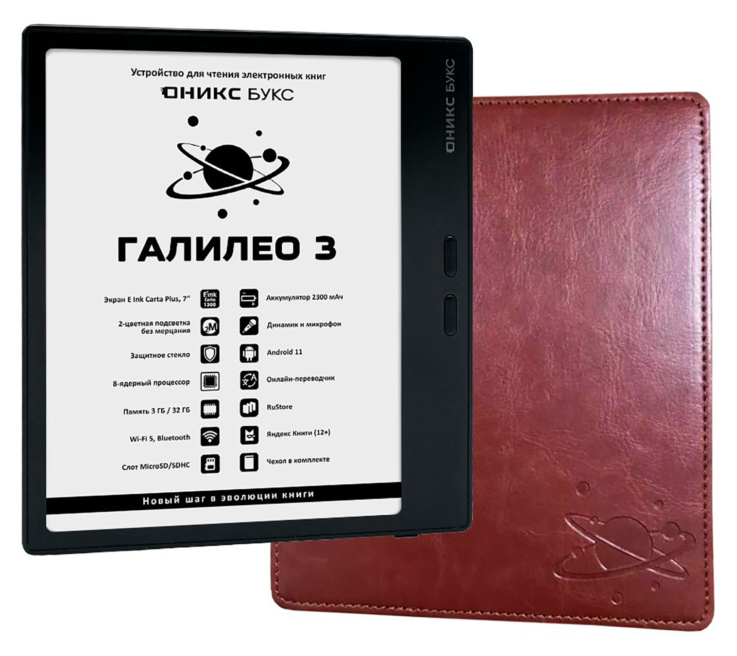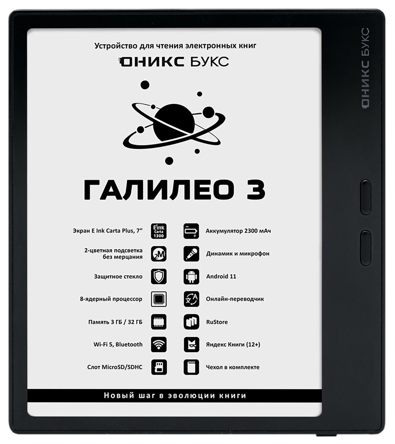 ОНИКС БУКС Галилео 2 — ридер с 7-дюймовым экраном высокого разрешения E Ink Carta Plus (Carta 1200) с подсветкой и сенсорным управлением. Благодаря увеличенному экрану Галилео 2 отображает на 30% больше информации, чем стандартные 6-дюймовые модели. Устройство имеет высокопроизводительную аппаратную платформу и базируется на ОС Android 11, позволяющей устанавливать и использовать дополнительные приложения. Ридер оборудован современными модулями Wi-Fi и Bluetooth, а 32 гигабайта встроенный памяти в сочетании со слотом microSD позволяют хранить огромную библиотеку книг и документов на устройстве. Аудиоплеер дает возможность прослушивать аудиокниги и музыку через встроенный динамик или наушники. Ридер выполнен в тонком компактном корпусе с кнопками управления на боковой стороне, а экран модели закрыт защитным стеклом. В комплекте с устройством поставляется «умная» защитная обложка.