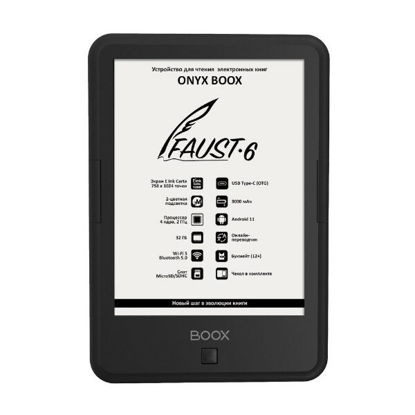 Купить Электронная книга ONYX BOOX Faust 6 черный, 758×1024, E-Ink Carta 1200, сенсор, подсветка, Wi-Fi, Bluetooth, 3000 мА*ч с доставкой по всей России.