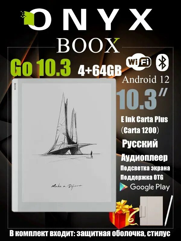 ONYX BOOX Go 10.3 — крупноформатный 10,3-дюймовый ридер, позволяющий делать рукописные заметки стилусом. Модель имеет экран высокого разрешения E Ink Carta Plus (Carta 1200) с двойным сенсорным управлением: ёмкостным для управления пальцами и индукционным для работы стилусом. Модель получила высокопроизводительную аппаратную платформу и легкий тонкий корпус, толщиной всего 4,5 мм. Ридер базируется на 8-ядерном процессоре и 4 ГБ оперативной памяти, а 64 гигабайт энергонезависимой памяти хватит для хранения большого количества книг и документов. Встроенный двухдиапазонный модуль Wi-Fi дает возможность выходить в Интернет и использовать сетевые сервисы, а поддержка Bluetooth 5.0 — подключать внешние устройства. С помощью программы-аудиоплеера можно прослушивать аудиокниги и музыку, также поддерживается функция Text-To-Speech. Модель работает под управлением ОС Android 12 и имеет встроенный магазин приложений Google play. ONYX BOOX Go 10.3 имеет защитное стекло ONYX Glass, предохраняющее экран от повреждений. Благодаря большому экрану и возможности делать рукописные заметки модель станет отличным выбором для тех, кто ля тех, кто планирует много работать с документами и хочет использовать возможность делать рукописные заметки. Данная модель не имеет встроенной подсветки экрана и предназначена для работы с внешним освещением.