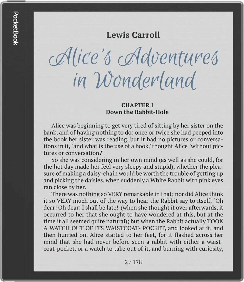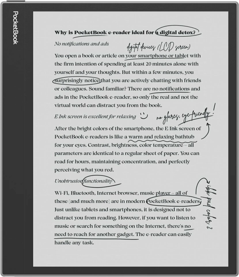 Модель оснащена G-сенсором и датчиком закрытия крышки, что добавляет удобства в использовании. Подключение к интернету осуществляется через Wi-Fi, а для передачи данных и подключения аксессуаров предусмотрены Bluetooth 5.0, USB Type-C и поддержка OTG. Устройство также поддерживает карты памяти microSD, что позволяет расширить объем памяти. Встроенные колонки, микрофон и камера делают PocketBook 1042 InkPad Eo многофункциональным устройством. Работает электронная книга на базе операционной системы Android 11, что обеспечивает совместимость с множеством приложений и форматов файлов. Поддерживаются текстовые форматы AZW, AZW3, DOC, DOCX, EPUB, FB2, FB2. ZIP, HTM, HTML, MOBI, PDF, PRC, RTF, TXT, фотоформаты PNG, BMP, JPEG и аудиоформаты MP3, WAV. Благодаря поддержке PocketBook Cloud, вы можете легко синхронизировать свои книги и документы между устройствами.