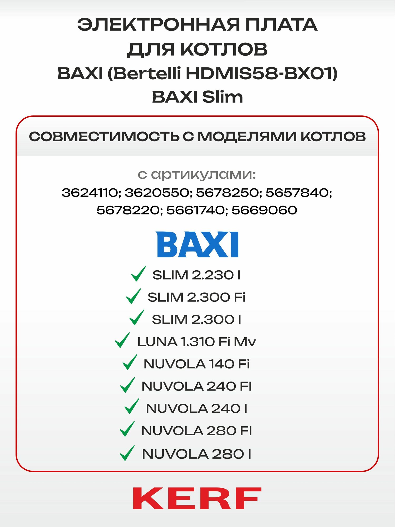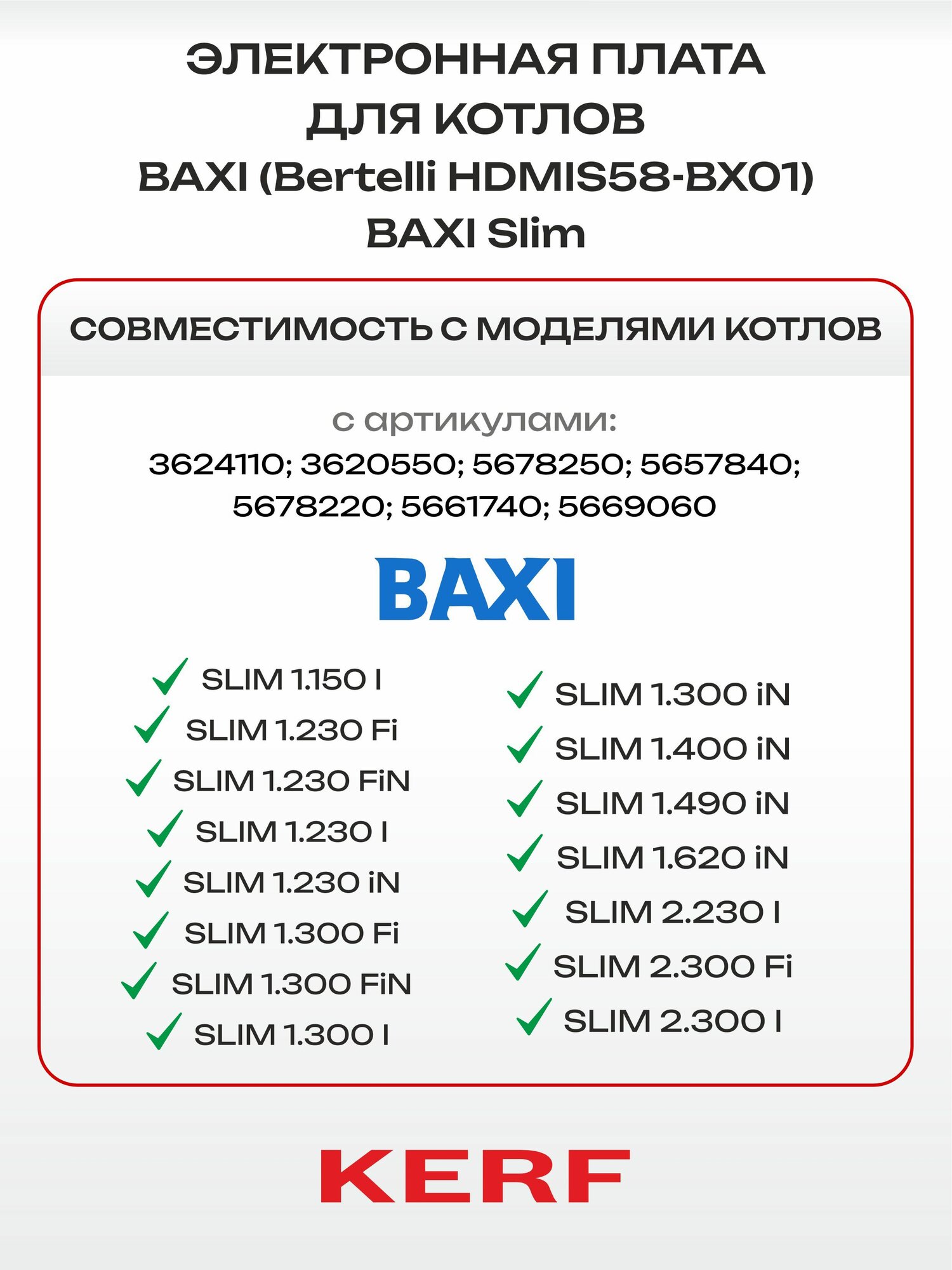 Электронная плата для котлов Kerf/Bertelli Baxi HDIMS58-BX01 SLIM (3620550;5657840;5678220;5678250;5661740;5669060;7837710): сравнение цен, характеристики, фото, актуальное наличие и цены.