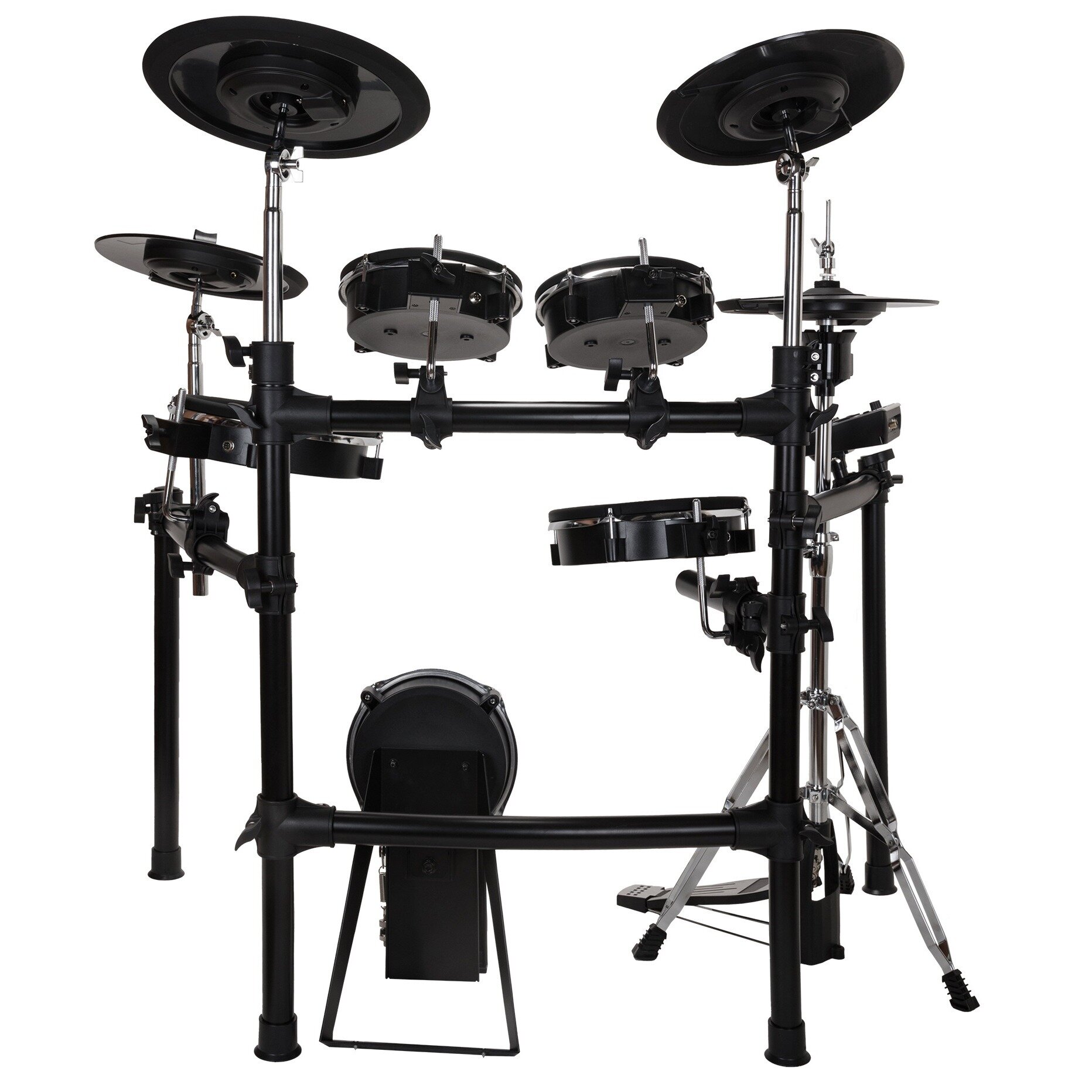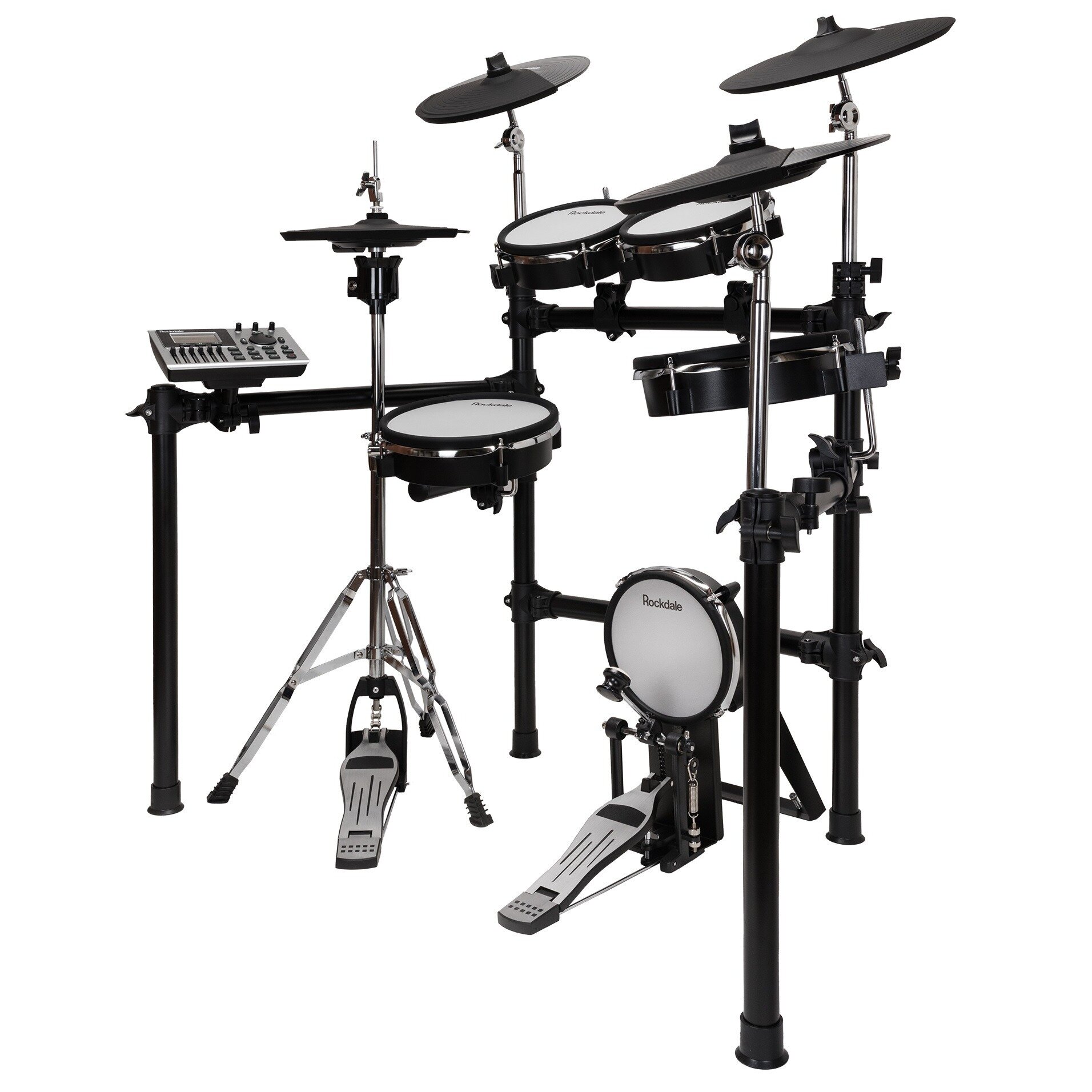 ROCKDALE DRUMS SD201-3SH Электронная ударная установка. Сетчатые двухзонные пэды :10”малый барабан, 8”том (2шт), 10”напольный том, 8”сетчатый пэд бас-барабана. 12”двухзонные тарелки 3шт: hi-hat, crash1, crash2. 13”трехзонная тарелка Ride. Стойка хай-хета. Педаль для бас-барабана. Прочная алюминиевая рама. 30 пресетов, 467 звуков, 15 аккомпанементов. Рекордер. Метроном. Входы: CD/MP3/Aux , USB/MIDI, Линейный выход. Соединительные кабели, барабанный ключ, блок питания в комплекте.