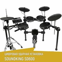 Профессиональная электронная ударная установка Soundking SD600 с тихими сетчатыми пэдами и мощным модулем на устойчивой раме.