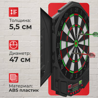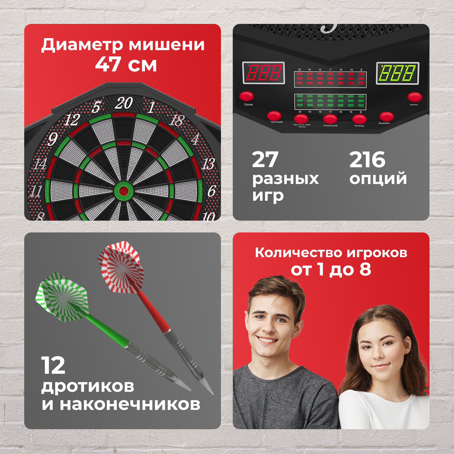 Изделие имеет семисегментный дисплей с яркими светодиодами, который включает в себя 27 различных игр и 216 опций. Также, счет очков для каждой команды подсвечивается другим цветом: зеленым или красным. Одновременно в дартс могут играть от 1 до 8 игроков, а подсчет очков для всех сегментов выполняется автоматически. Возможность звукового сопровождения игры сделает ее более активной и увлекательной.