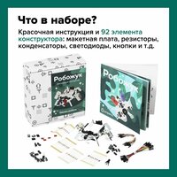 Комплектация школьного развивающего конструктора: (важно: батарейки в комплект не входят): платформа с макетной платой «Робожук» - 1 шт, резистор 220 Ом – 10 шт, резистор 1 кОм / 10 кОм / 100 кОм – по 10 шт, конденсатор электролитический 10 мкФ / 220 мкФ – по 4 шт, светодиод красный мини – 4 шт, светодиод поверхностный – 6 шт, светодиод большой красный / синий – по 1 шт, транзистор – 4 шт, кнопка тактовая – 4 шт, переменный резистор (потенциометр) – 1 шт, инфракрасный приемник – 1 шт, электронный таймер 555 – 3 шт, десятичный счетчик – 1 шт, звуковой пьезоизлучатель (пьезопищалка) – 1 шт, мотор – 1 шт, провода «мама-папа» – 15 шт, провода «папа-папа» – 15 шт, батарейный отсек 4хААА – 1 шт.