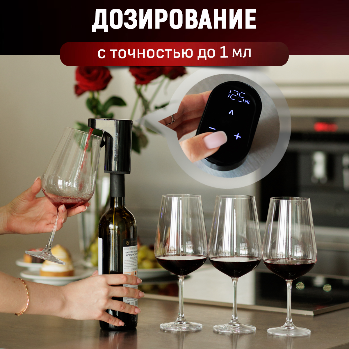 Представляем электронный аэратор для вина - идеальный аксессуар для настоящих ценителей! Он не только помогает наливать желаемое количество алкоголя с точностью до миллилитра, но и обогащает его кислородом, даря ему более глубокий и насыщенный вкус и аромат. Таким образом, вы сможете насладиться даже молодым вином, которому обычно требуется продолжительное время выдержки. Сенсорный электро насос сделает алкогольный напиток более гармоничным и мягким, словно вы наслаждаетесь старым и длительно выдержанным вином. При необходимости функцию аэрации можно отключить, это актуально для дорогих, коллекционных вин с большой выдержкой. Автоматический диспенсер удобен в применении - достаточно надеть помпу на бутылку и включить нажатием одной кнопки. Другое преимущество прибора - его универсальность. Он подходит для разных видов горячительного: красного и белого вин, виски, коньяка, водки или рома, а насадка совместима с подавляющим большинством бутылей разных форм и размеров, для этого в комплекте есть 3 специальных адаптера. Электрический дозатор для спиртного заряжается с помощью usb кабеля, что делает его экономичным и экологичным в использовании. Винный набор - отличная идея для подарка. Подарочная упаковка дополнительно упаковывается в пленку и плотный транспортировочный короб, который гарантирует идеальный внешний вид товара при получении. Независимо от того, являетесь ли вы сомелье или любителем, этот гаджет станет вашим незаменимым спутником и помощником в создании прекрасных вечеров и запоминающихся встреч.
