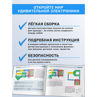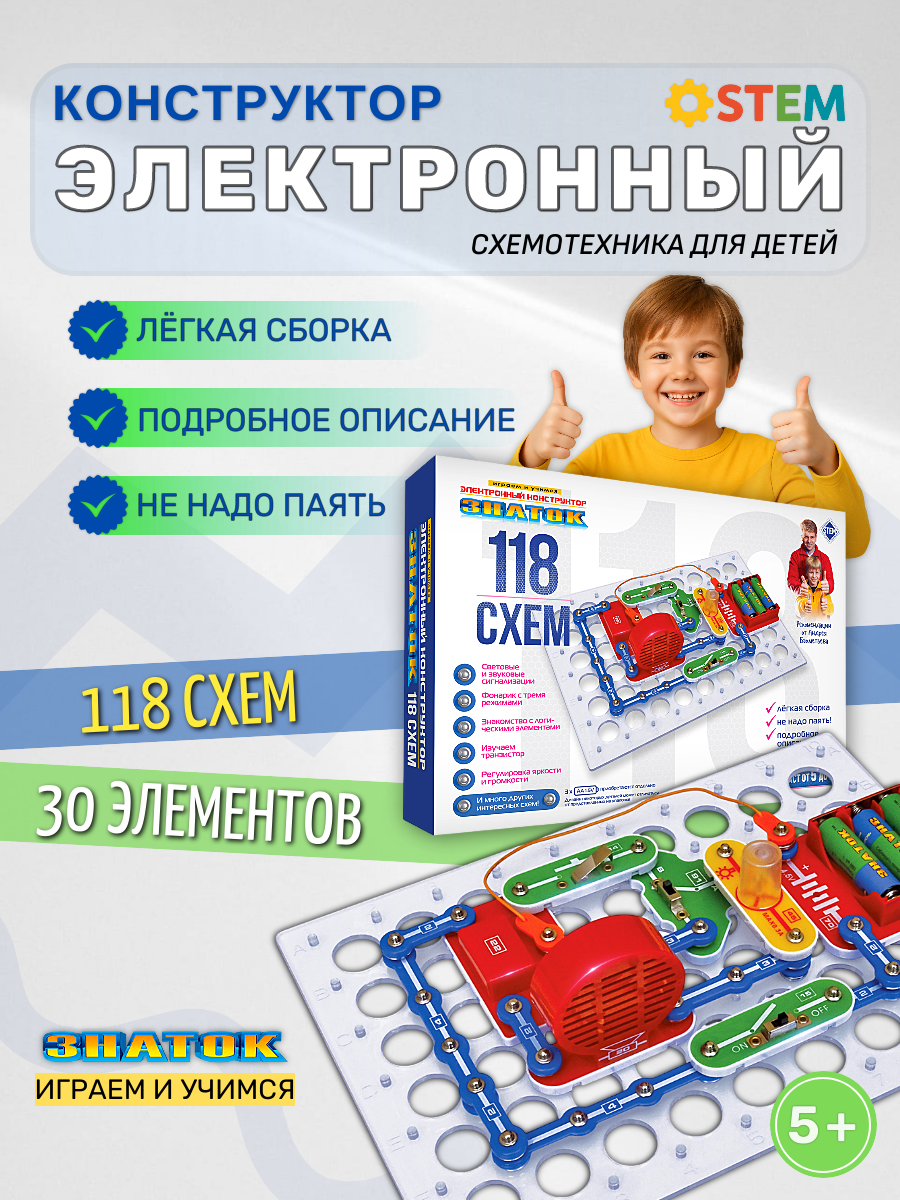 Детский электронный конструктор знаток 118 схем начального уровня познакомит с удивительным миром электроники. Ребенок самостоятельно сможет собрать световые и звуковые сигнализации, познакомится с логическими элементами, транзистором, воспользуется регулировкой яркости и громкости. Это лучший обучающий инструмент для изучения физики специально разработанный для детей, основанный на многолетнем опыте экспертов по электронике! Схемы имеют наглядный и принципиальный вид. Отличный подарок для мальчиков и девочек в возрасте от 5 до 16 лет. Яркое и понятное руководство поможет вам, всего за несколько минут, собрать и испытать схему! Ваш ребёнок научится собирать электрические схемы и выполнять задания к ним. Абсолютная безопасность и простота сборки - не надо паять! Удовольствие получают не только дети, но и их родители! Подарок, подарок девочке, подарок мальчику, подарки детям, подарок на новый год, подарок на день рождения, конструктор обучающий, конструктор развивающий, конструктор электронный, конструктор для детей, конструктор знаток, детский конструктор.