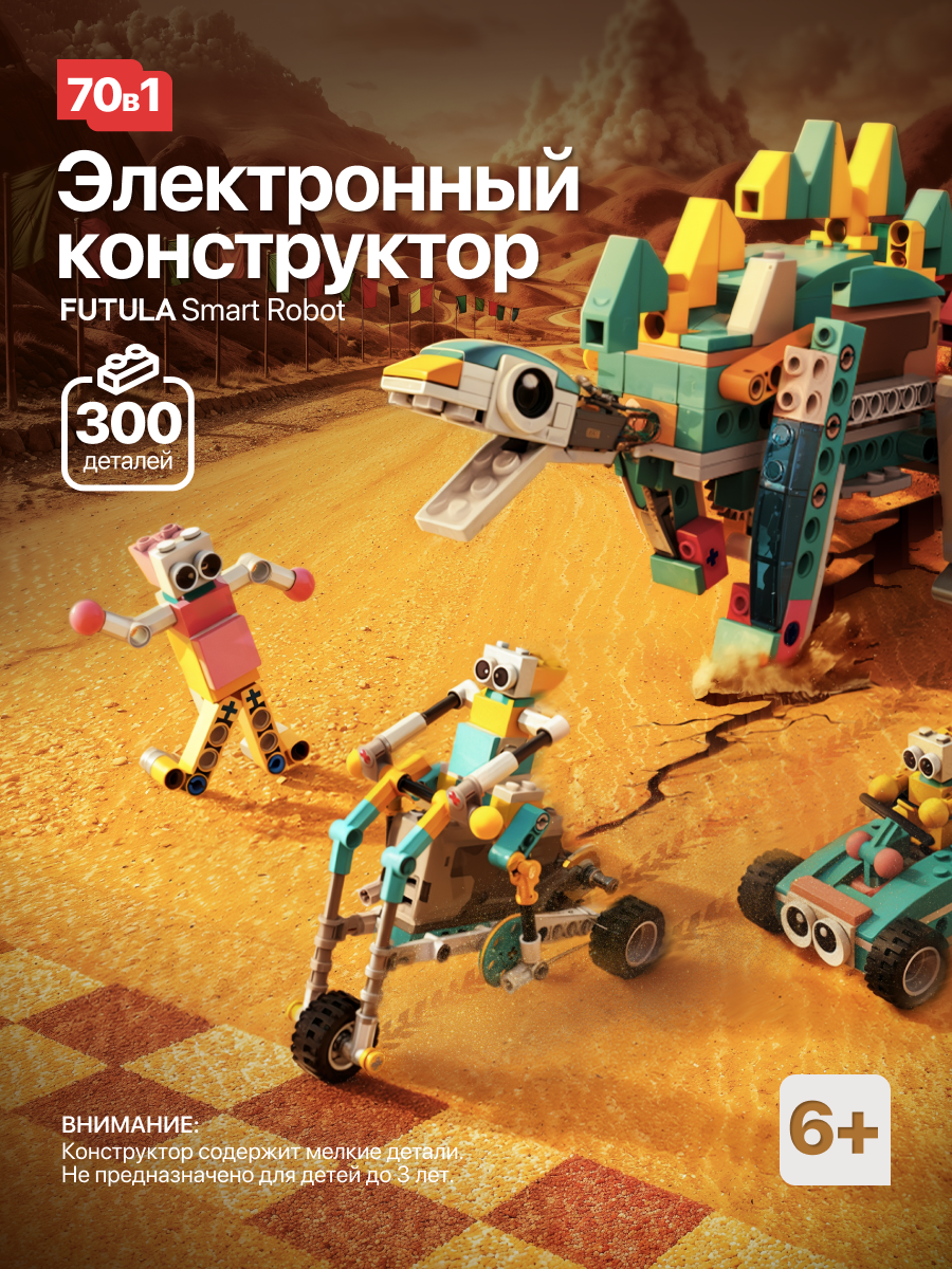 Электронный конструктор FUTULA Smart Robot в мире робототехники — это идеальная игрушка для мальчиков, девочек и подростков, которые стремятся развивать свои навыки в технических дисциплинах. С набором, состоящим из 300 деталей, ваш ребенок сможет создать уникальные модели, такие как робот, динозавр, корабль или строительный кран. Каждый из проектов увлекателен, способствует развитию творческого мышления. Моторчик контролирует передвижение фигурки или автомобиля. В инструкции есть пошаговые схемы и все алгоритмы доступны в AppStore и GooglePlay.