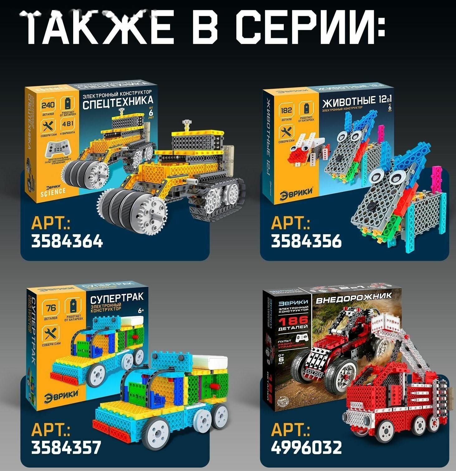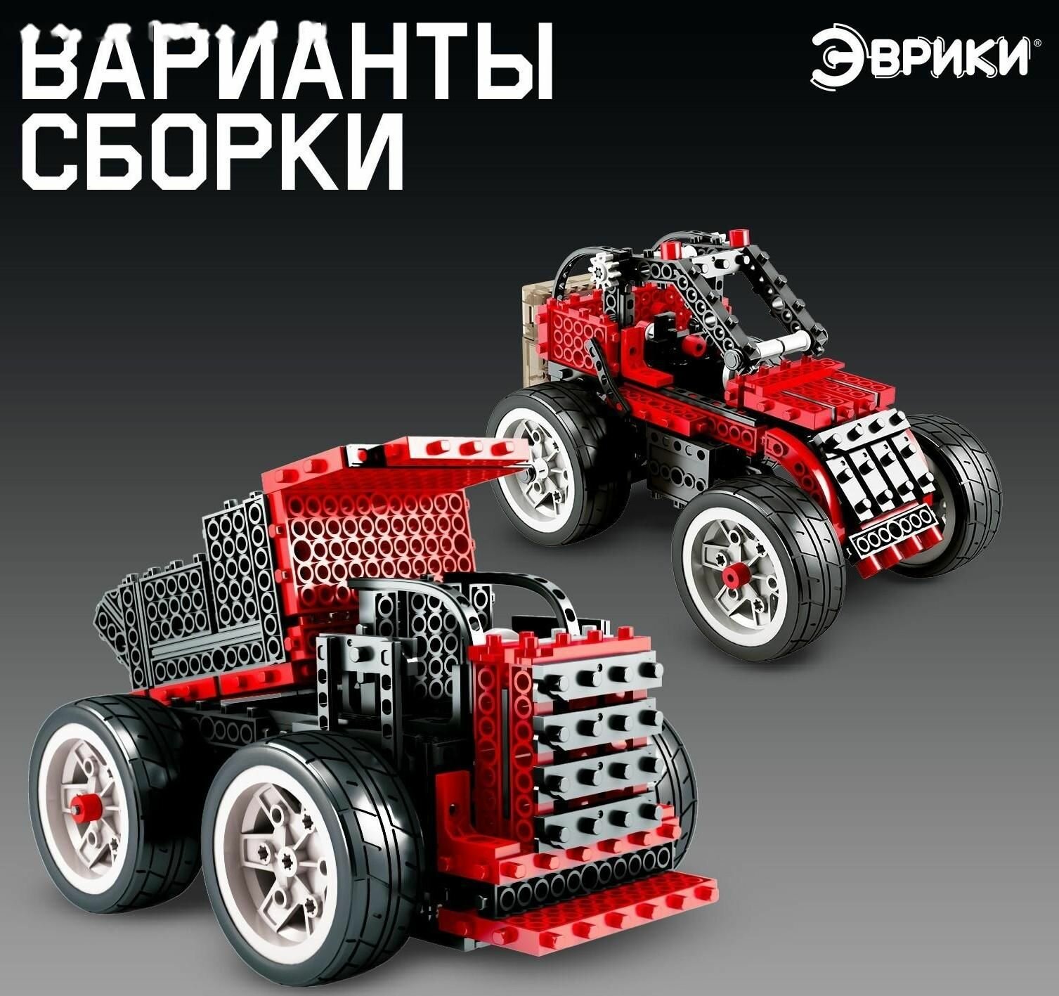 Благодаря электронному конструктору на радиоуправлении «Эврики» ребёнок соберёт несколько видов техники с подвижными элементами. Конструктор двигается с помощью электромеханического привода. В инструкции ребёнок найдёт 2 варианта сборки.