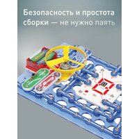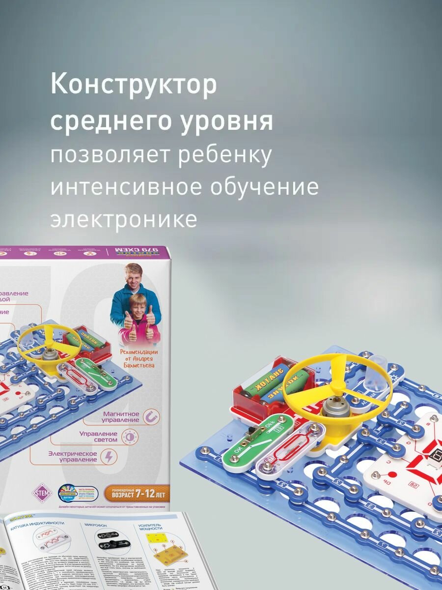 Электронный конструктор для мальчиков и девочек среднего уровня сложности, познакомит ребенка с удивительным миром электроники. Без помощи взрослых ваш маленький инженер за несколько минут сможет собрать удивительные схемы, с практически 100% положительным результатом и удивить родителей, друзей, и учителей. Знаток имеет 979 необычных и интересных схем, начиная от летающего пропеллера и заканчивая детектором лжи и музыкальными звонками. Каждая схема разработана с учетом образовательных потребностей детей и покрывает широкий спектр тем, таких как управление водой, светом, звуком и магнитом. Интерактивный конструктор для малышей не только развивает инженерные навыки, но и внедряет основы физики, логики в игровой процесс. Летающий пропеллер, лампа, радиоприёмники, светодиодные фонарики, сирены, охранные сигнализации, музыкальные звонки, автоматические осветители, детектор лжи, измерительные приборы – все это и многое другое вы сможете собрать при помощи этой развивающей игрушки. Наш детский конструктор предлагает разнообразные проекты – от простых световых устройств до сложных механизмов, что позволяет детям постепенно усложнять задачи и расширять свои знания. Наглядные и принципиальные схемы, представленные в каждом проекте, не только помогут в сборке, но и поддержат образовательный процесс, углубляя понимание принципов работы устройств. Кроме того, знаток обеспечивает абсолютную безопасность и простоту сборки без необходимости пайки. Дети смогут наслаждаться процессом творчества, не беспокоясь о безопасности. Рекомендуется для детей 7-12 лет, но он рассчитан практически на любой возраст – даже дедушкам будет интересно поиграть вместе с внуками. Простота соединений и ясность описания позволяет даже самым маленьким, начиная с 5 лет, с удовольствием исследовать мир электроники, а также взрослому человеку будет интересно собрать и опробовать схему, а затем воплотить её в реальной жизни. Для работы схем потребуется всего 4 батарейки (не входят в комплект) размером АА. Ваши дети будут в восторге от возможности создавать собственные удивительные устройства и делиться своими идеями с родителями и друзьями. Присоединяйтесь к увлекательному миру знаток и подарите вашим детям незабываемые впечатления от изучения электроники.