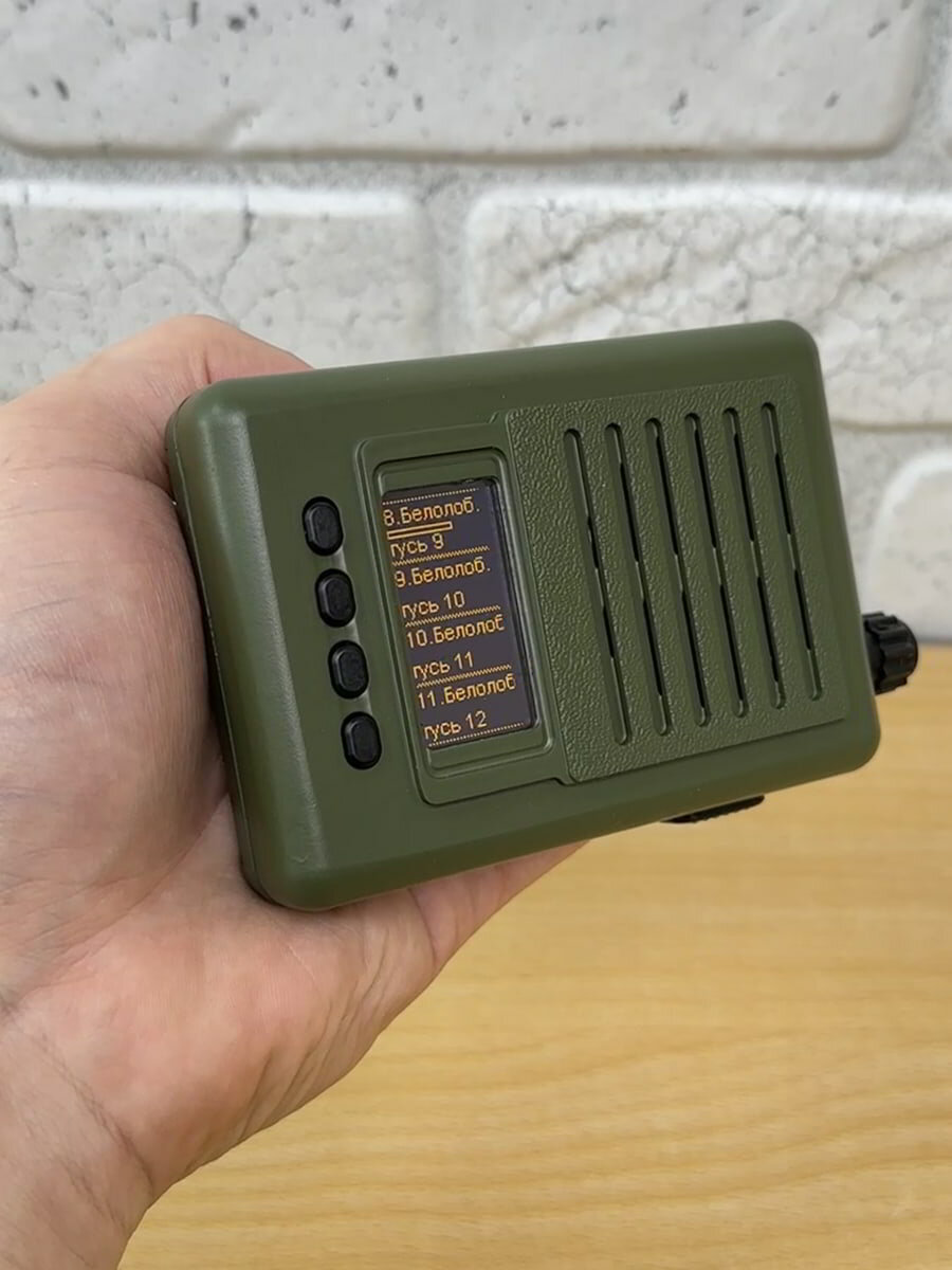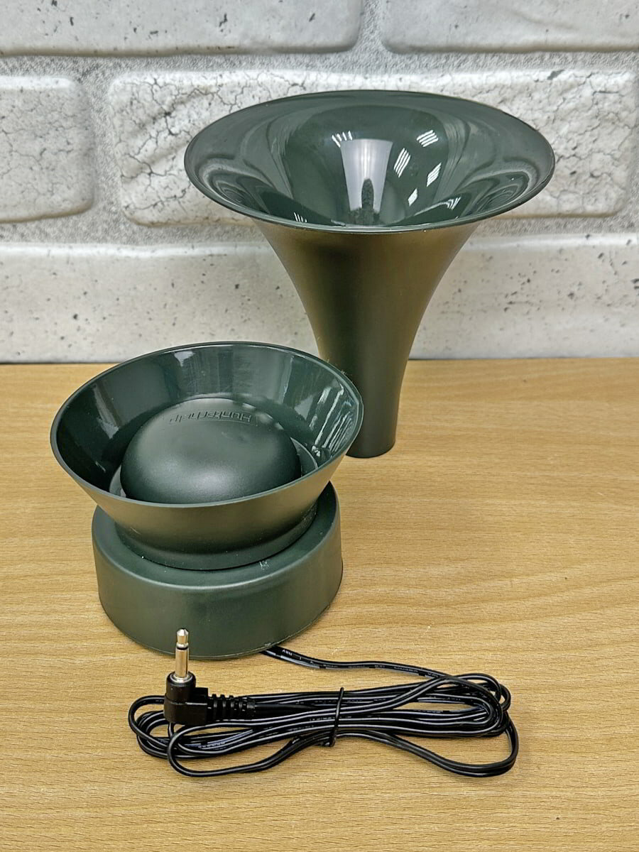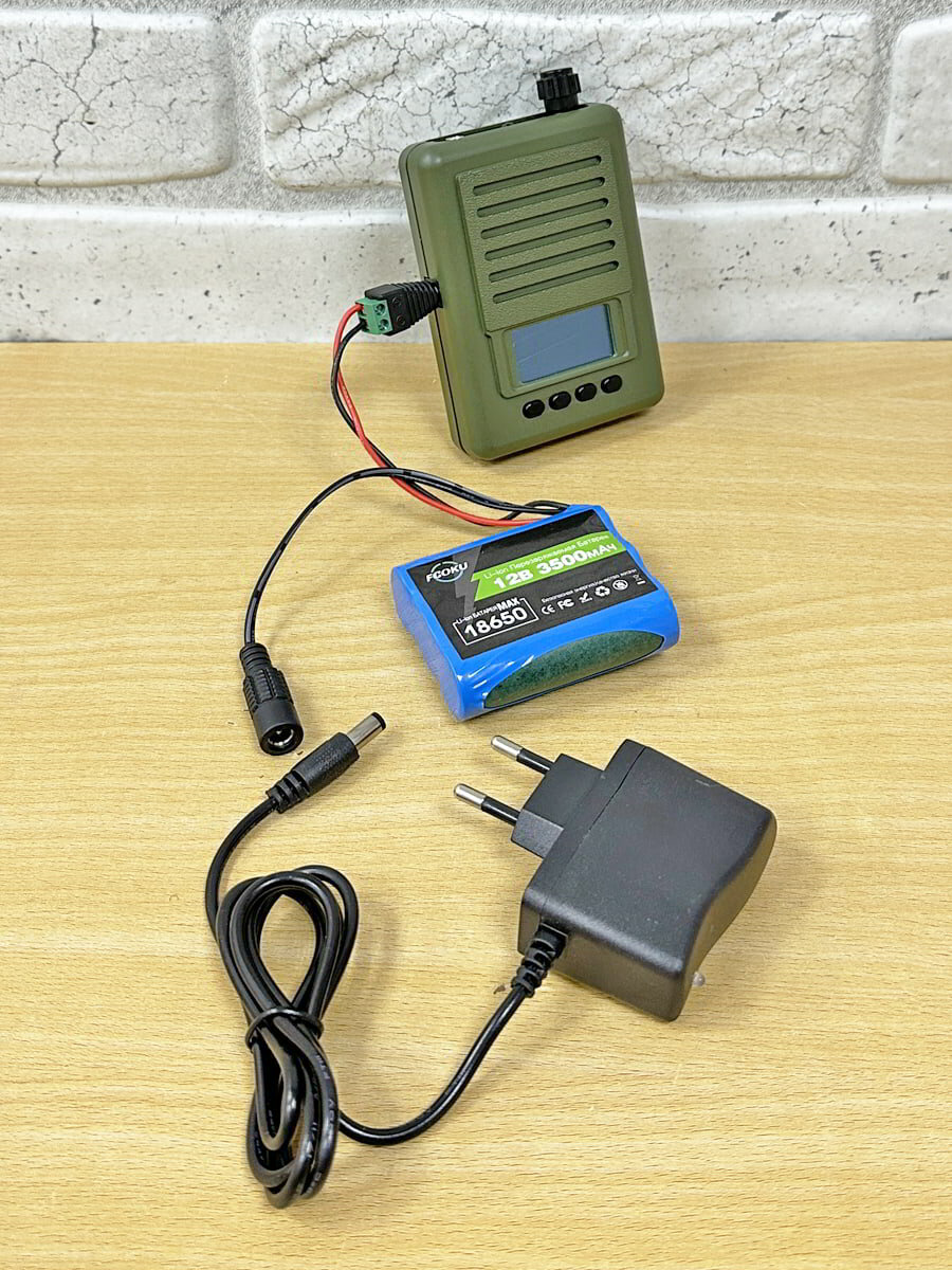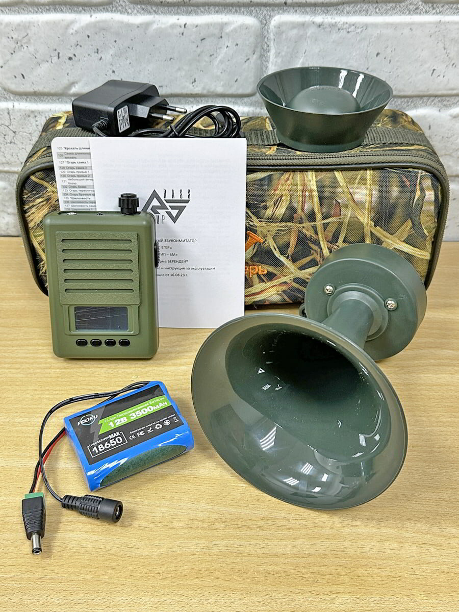 Электронный манок с фонотекой на 248 голосов птиц и зверей. Имеет цифровой усилитель сигнала, повышающий мощность и дальность действия. Оснащен большим OLED-дисплеем и дополнительными функциями: часы, таймер, секундомер, будильник. Эл манок Егерь имеет встроенный динамик с дальностью приманивания до 150 м. Для увеличения радиуса действия в комплект поставки входит 1 внешний динамик ТК9-RU. Отличительной чертой Егерь 6М является встроенная операционная система управления манком, с помощью которой можно выводить данные на дисплей и отправлять через него команды. Помимо этого, система в автономном режиме обрабатывает звуковые дорожки в цифроаналоговом формате, регулирует напряжение в системе питания и управляет таймером. Динамик ТК9-RU - пассивный внешний звуковой модуль. Эффективен при использовании на небольших территориях площадью до 2 кв.км. За счет специальной насадки в виде "колокола" динамик идеально передает четкие и естественные звуки птиц и животных. Корпус выполнен из ударопрочного и влагостойкого пластика, который позволяет использовать динамик в самых экстремальных условиях. Допустимый температурный диапазон от -40 до +40°С. Подключение происходит при помощи кабеля с разъемом типа "Джек" 3,5мм. Кабель поставляется в комплекте с динамиком. Питание происходит за счет манка. Сумка, входящая в комплект, предназначена для транспортировки одного динамика ТК9-RU, Манка и комплекта соединительных проводов. Особенности Большая память - на съёмной microSD карте памяти манка уже записаны звуки духовых манков и голоса зверей и птиц, всего 248. Отличное качество аудио - в два раза лучше, чем у большинства приборов других производителей (16 бит вместо 8). Простое управление. Своевременное предупреждение о низком заряде батареи. Можно установить паузу между циклически воспроизводимыми голосами. Приличная дальность звучания встроенного динамика - до 150 метров. Легкость и компактность - по размеру манок немного больше сотового телефона и весит всего 155 грамм (вместе с батареей). Встроенный фонарик существенно облегчает использование прибора в темноте. Дополнительные функции: таймера, секундомера, часов с будильником. Особое прорезиненное покрытие - обеспечивает прекрасный внешний вид и приятные тактильные ощущения при работе с прибором. Два альтернативных источника питания: батарея 9 В типа «Крона» (6LF 22) или внешний источник 6-12 В. Как работает Пользоваться устройством очень просто. Сразу после включения (для этого нужно нажать на торец энкодера) электро манок переходит в режим ожидания. Чтобы начать воспроизведение голоса, нажмите соответствующую кнопку, перед этим выбрав подходящий голос (если Вы ничего не выберете, включится тот голос, который был установлен перед последним выключением). Чтобы выбрать новый голос, вращайте ручку комбинированного регулятора. Выбор подтверждается нажатием кнопки управления. Вы можете поменять голос в любой удобный момент: и в режиме ожидания, и во время воспроизведения. Также поддерживается возможность установки пауз и настройки громкости звучания при помощи энкодера. Чтобы отключить манок, нажмите на торец энкодера и в течение нескольких секунд удерживайте его в таком положении. При выключении электрический манок запоминает номер последней выбранной Вами фонограммы и громкость воспроизведения. Где 