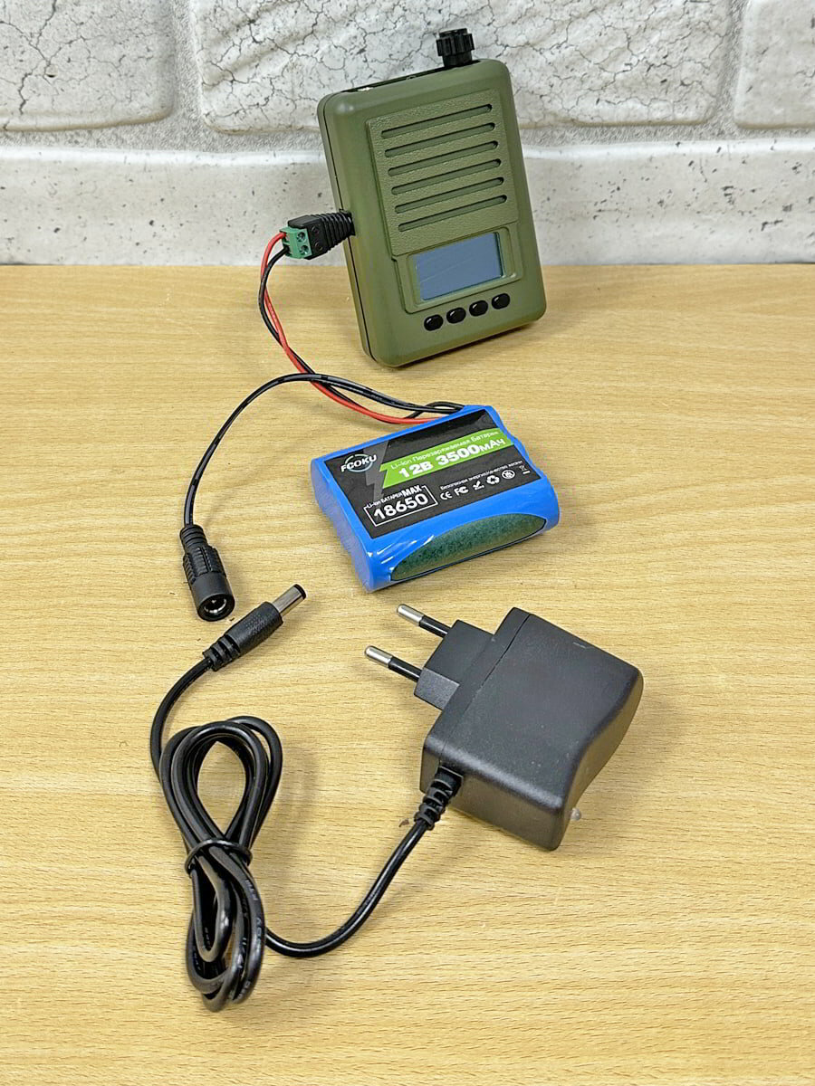 - Питание от внешнего аккумулятора на 3500 мАч - в комплекте зарядка и Li-ion аккумулятор, обеспечивает до 12 ч непрерывной работы манка. Можно использовать батарею 9В «Крона» (6LF 22) или подключить внешний источник 6-12 В.