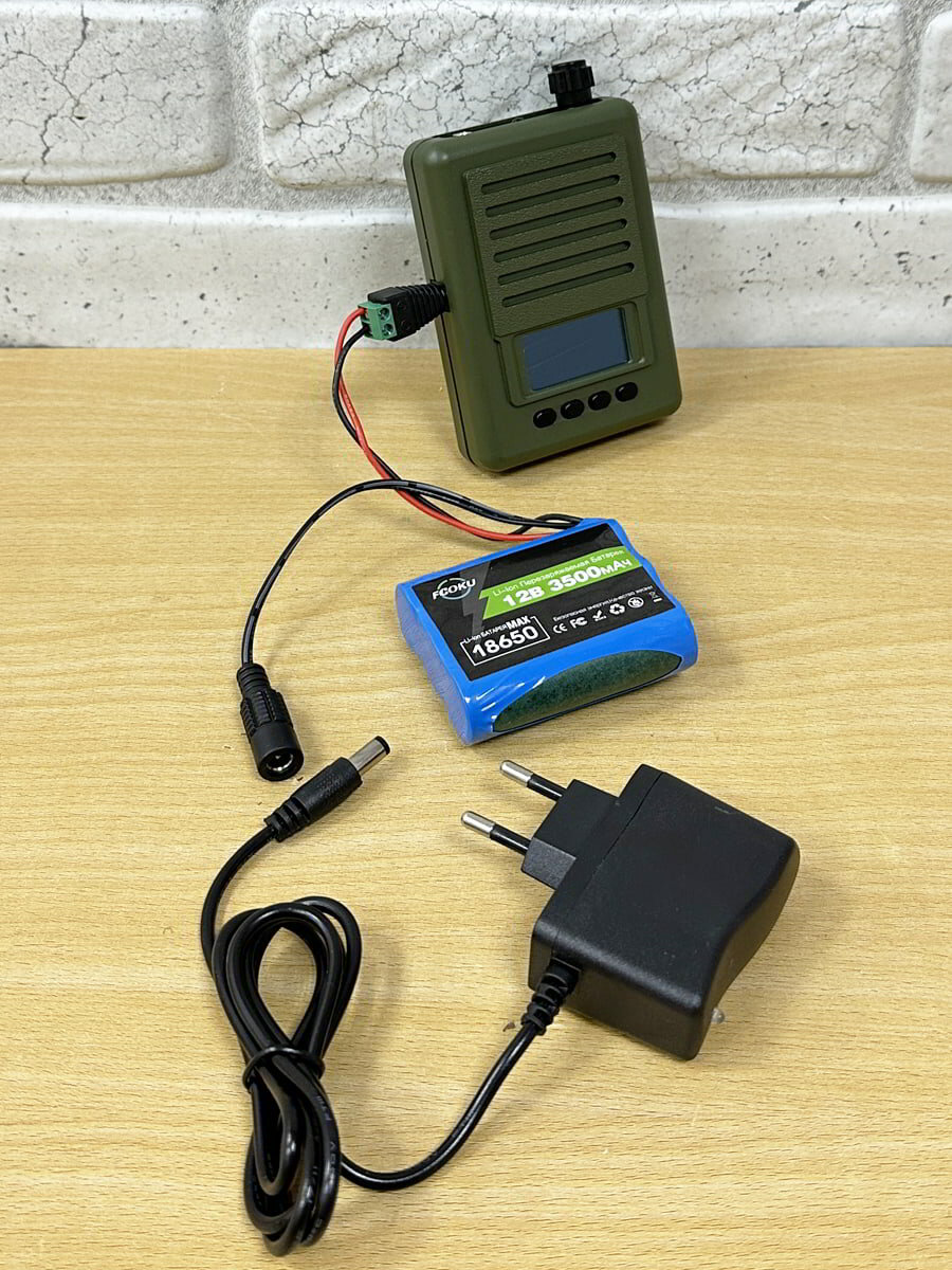 Электронный манок Егерь 6М с внешним динамиком, аккумулятором с зарядным устройством, сумкой и фонотекой на 248 голосов для охоты на гуся, утку, рябчика, прочих птиц и зверей. Охотничий электроманок имеет цифровой усилитель сигнала, повышающий мощность и дальность действия. Информативный OLED дисплей с дополнительными функциями – часы, таймер, секундомер, будильник. Дальность действия встроенного динамика – 150 м, для увеличения радиуса подключается внешний динамик. Предусмотрено внутреннее питание Крона 9 В, также электро имитатор голосов работает от внешнего питания – аккумулятор от 6 до 12В. Отличительной чертой охотничьего манка Егерь 6M является встроенная операционная система – можно выводить данные на дисплей и отправлять через него команды. Эл приманка в автономном режиме обрабатывает звуковые дорожки в цифроаналоговом формате, регулирует напряжение и управляет таймером. Также манки Егерь 6M можно использовать в качестве яркого фонаря. Низкочастотный динамик «УД-5» мощностью 5 Вт увеличивает дальность действия манка до 1000 м. Универсальная колонка эффективна на популярных охотах на копытных, боровую и болотно-луговую дичь, многих водоплавающих. Электрический динамик имеет компактный размер и вес всего 270 г, а также чехол и крепление на ремень охотника. Сумка предназначена для транспортировки одного динамика, манка Егерь-6M и соединительных кабелей. Особенности Большая память – на съёмной microSD карте записаны звуки духовых манков и голоса зверей и птиц, всего 248. Фонотека «живая» рабочая, проверенная профессиональными охотниками. Отличное качество аудио – в два раза лучше большинства аналогов (16 бит вместо 8). Простое управление, можно задать паузу между циклически воспроизводимыми голосами. Своевременное предупреждение о низком заряде батареи. Приличная дальность звучания встроенного динамика – до 150 м. Может работать с дополнительными внешними динамиками – в комплекте динамик «УД-5» 5 Вт с дальностью до 1000 м. Легкость и компактность – манок немного больше сотового и весит всего 155 г вместе с батареей. Встроенный фонарик облегчает использование в темноте. Дополнительные функции – таймер, секундомер, часы с будильником. Особое прорезиненное покрытие – обеспечивает прекрасный внешний вид и приятные тактильные ощущения. Два альтернативных источника питания – на батарейках 1 шт Крона 9 В (6LF 22) или внешний источник 6-12 В (поставляется в комплекте с зарядным устройством). Как работает Нажмите на торец энкодера для включения – манок перейдет в режим ожидания. Выберите трек и нажмите соответствующую кнопку. Если ничего не выбрать, включится голос, который играл перед выключением. Чтобы выбрать новый голос, вращайте ручку регулятора. Выбор подтверждается нажатием кнопки управления. Меняйте треки в любой удобный момент – в режиме ожидания (молчания) или во время воспроизведения. Есть возможность установки пауз и настройки громкости при помощи энкодера. Чтобы отключить манок, зажмите торец энкодера – дисплей погаснет. При выключении манок запоминает громкость и номер последнего трека. Где можно использовать Манок электроный Егерь-6М с динамиком и записями на 248 голосов абсолютно универсален и подходит для самых разных задач: как традиционный утиный (кряква, свиязь, шилохвост, чирок и др.) и гусиный манок (добыча утки кряк