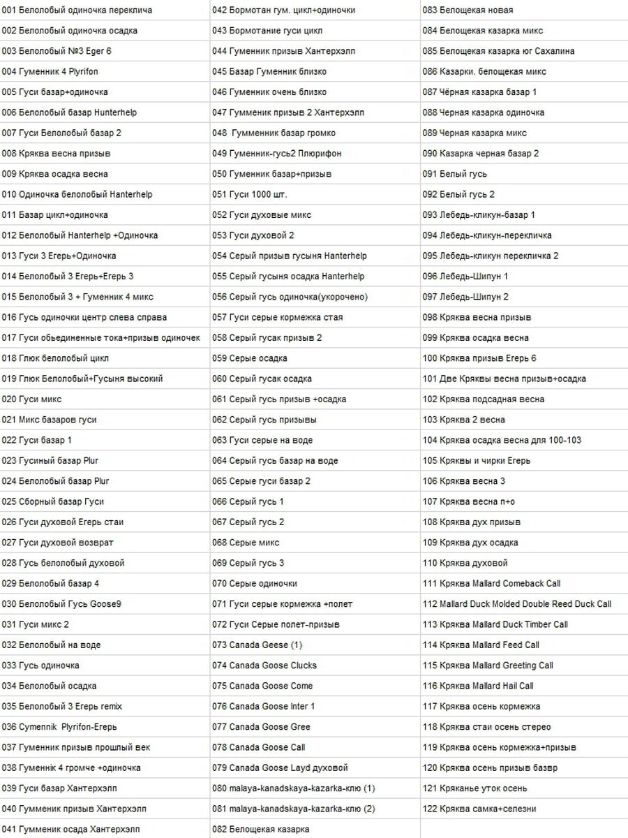 Электрический манок Минск-2 с точностью воспроизводит голоса рябчика, перепела, уток и селезня (кряква и др.), вальдшнепа, глухаря, тетерева, куропатку, утиный и гусиный голоса (белолобого, серого, гуменника). Эффективен как приманка на кабана, марала (благородный олень), изюбря, лисицу (крик, мышь, заяц) и другого хищника. Полный список голосов в комплекте. Для начала работы: