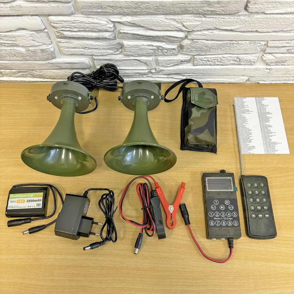 - Два динамика на неодимовых магнитах с дальностью звучания до 5 км. Мощность каждого – 50 Вт. Позволяют эффективно подманивать птицу и зверя с большого расстояния. Каждая колонка имеет кронштейн, с помощью которого динамик легко закрепить на дереве.