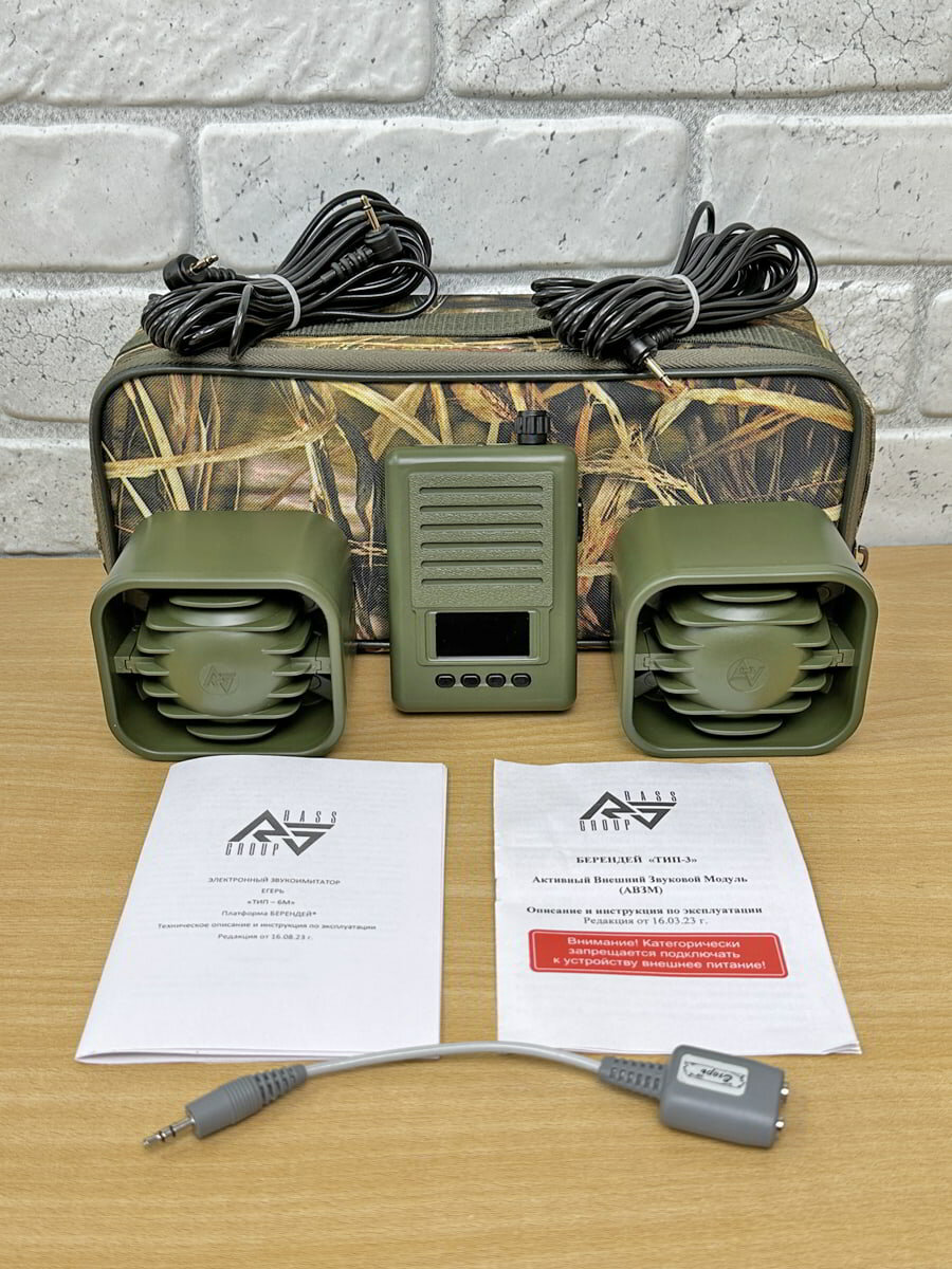 Активный динамик Берендей АВЗМ-3 со встроенным цифровым усилителем мощностью 10 Вт позволяет увеличить дальность приманивания до 7000 метров (в идеальных условиях). Работает как в активном режиме, так и в пассивном. Пассивный режим работы полностью аналогичен режиму работы обычного динамика, при этом питание динамика осуществляется от манка. В активном режиме динамик использует собственные элементы питания (6 батареек типа АА, 9 В).