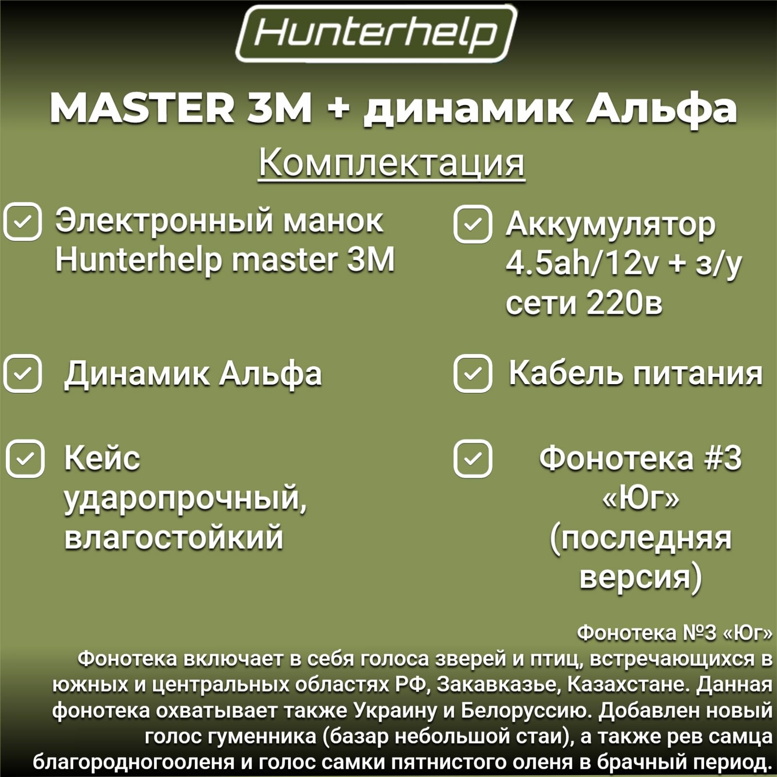 Электронный манок Hunterhelp MASTER 3M в комплекте с динамиком Альфа #3 Юг: сравнение цен, характеристики, фото, актуальное наличие и цены.