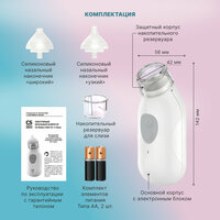 Аспирационный блок (силиконовый назальный наконечник «широкий», силиконовый назальный наконечник «узкий», накопительный резервуар для слизи, защитный корпус накопительного резервуара для слизи), основной корпус с электронным блоком, крышка отсека элементов питания, комплект элементов питания типа АА, 2 шт., руководство по эксплуатации с гарантийным талоном