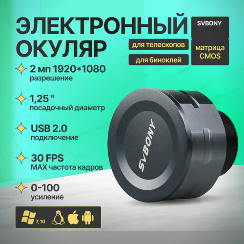 Электронный окуляр SVBONY SV105 1,25' CMOS предназначен для наблюдений и изучения астрономии, разработанное специально для пользователей телескопов и биноклей. Электроника позволяет проводить качественную цифровую съемку, обеспечивая возможность наблюдения и записи изображений звездного неба с высоким разрешением. Благодаря универсальности и удобству использования аксессуар подходит как для любителей, так и для опытных астрономов, заинтересованных в изучении и документировании космических объектов.