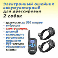 Электроошейник Petrainer PET998DBB-1 с пультом ДУ и приёмником для тренировки 2 (двух) собак от 3,5 кг. Дальность до 300 метров, 100 вариантов электрического разряда и вибрации, звук, влагозащищённый корпус, световой индикатор на ошейнике (ресивере), размеры электродов 10 мм, 13 мм, функциональный пульт ДУ, обрезиненные кнопки, кнопка вкл/выкл на ресивере, зарядка от USB.