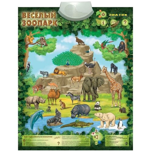 На электронном плакате "Весёлый зоопарк" от российской компании "Знаток" изображена гора и водоем, где расположились самые разные животные. С его помощью ребенок не только увидит, как выглядят некоторые экзотические животные, живущие в дикой природе, но и услышать их голоса. Нажав на кнопку "Звуки", а затем на кнопку рядом с животным, дети услышат звуки, которые издаёт животное. А при нажатии на кнопку "Информация", услышат короткий рассказ об особенностях этого животного.