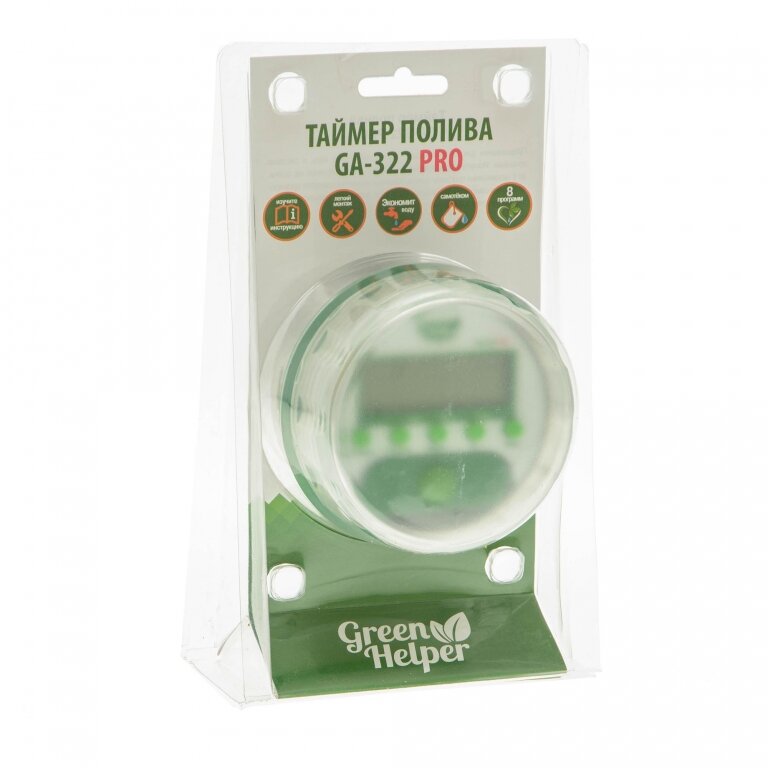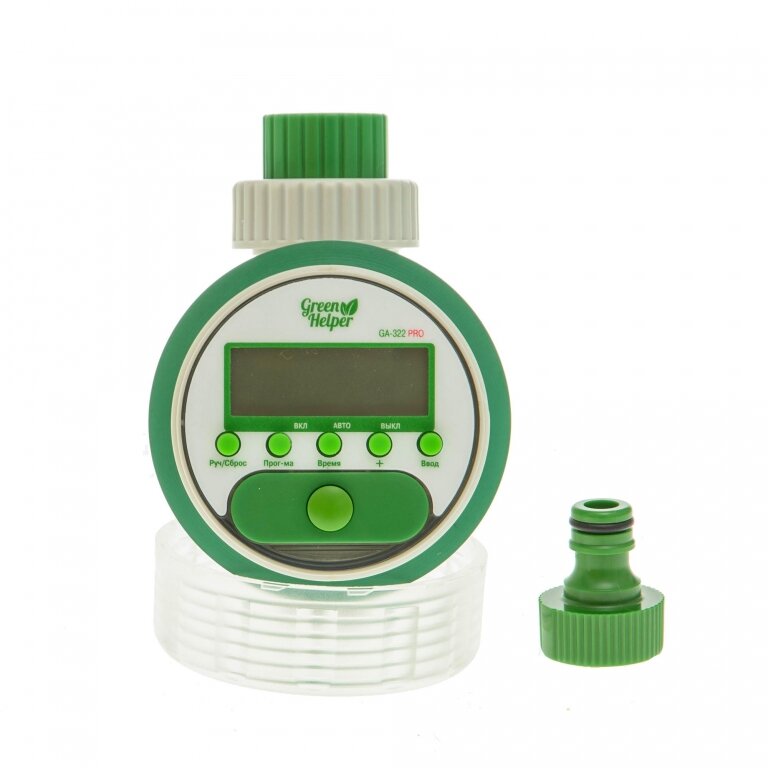 Автономный программируемый таймер полива Грин Хелпер с шаровым исполнительным механизмом. Устройство позволяет осуществлять забор воды из емкости (система с нулевым давлением, самотек), также возможна подача воды от водопровода с давлением до 3 атм. Циклический механизм Green Helper GA-322PRO может одновременно выполнять до 8 различных программ полива теплицы, огорода, цветов. Усиленный клапан фиксации обеспечивает надежность и долговечность прибора. Электронный таймер полива работает от 2-х батареек ААА (не входят в комплект).
