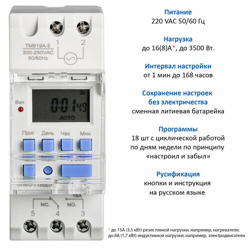Главные особенности данного таймера - наличие силового реле, рассчитанного под нагрузку до 3,5 кВт, а также возможность настраивать 16 различных программ с точностью установки от 1 минуты до 168 часов. Т. е. если Вам необходимо включить бойлер с мощным тэном, то он справится с данной задачей без всяких проблем.