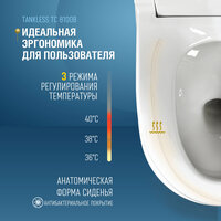 Сифонный смыв воды; Система смыва "торнадо"; Авто.смыв; Ночная подсветка; Эргономичное сиденье; Подогрев сиденья; Большой и малый тип смыва; Пульт управления.