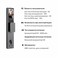 Емкость пользователя: Кол-во отпечатков пальцев ~ 50; Пин-код пользователя ~ 100; Кол-во лиц к распознаванию ~ 30; Кол-во RFID-карт ~ 100.