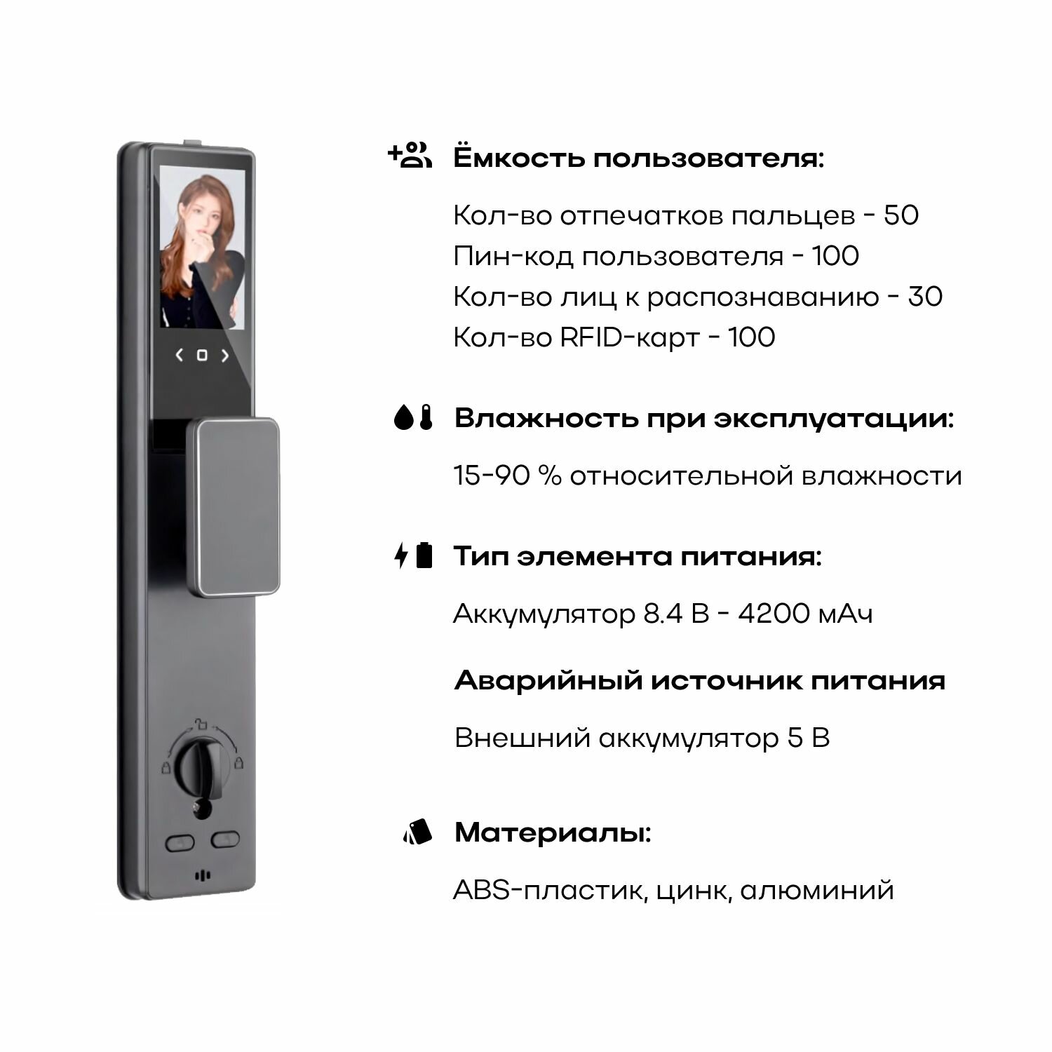 Способы открытия: Распознавание лица, отпечаток пальца, RFID-карта, пин-код, ключ, WIFI(через приложение).