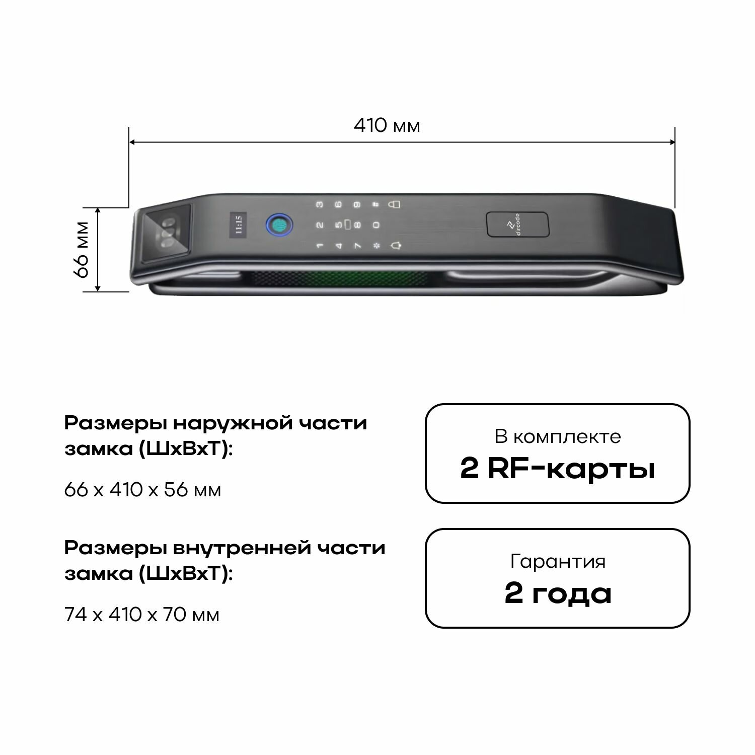 Размеры наружной части замка (ШхВхТ): 66 х 410 х 56 мм.