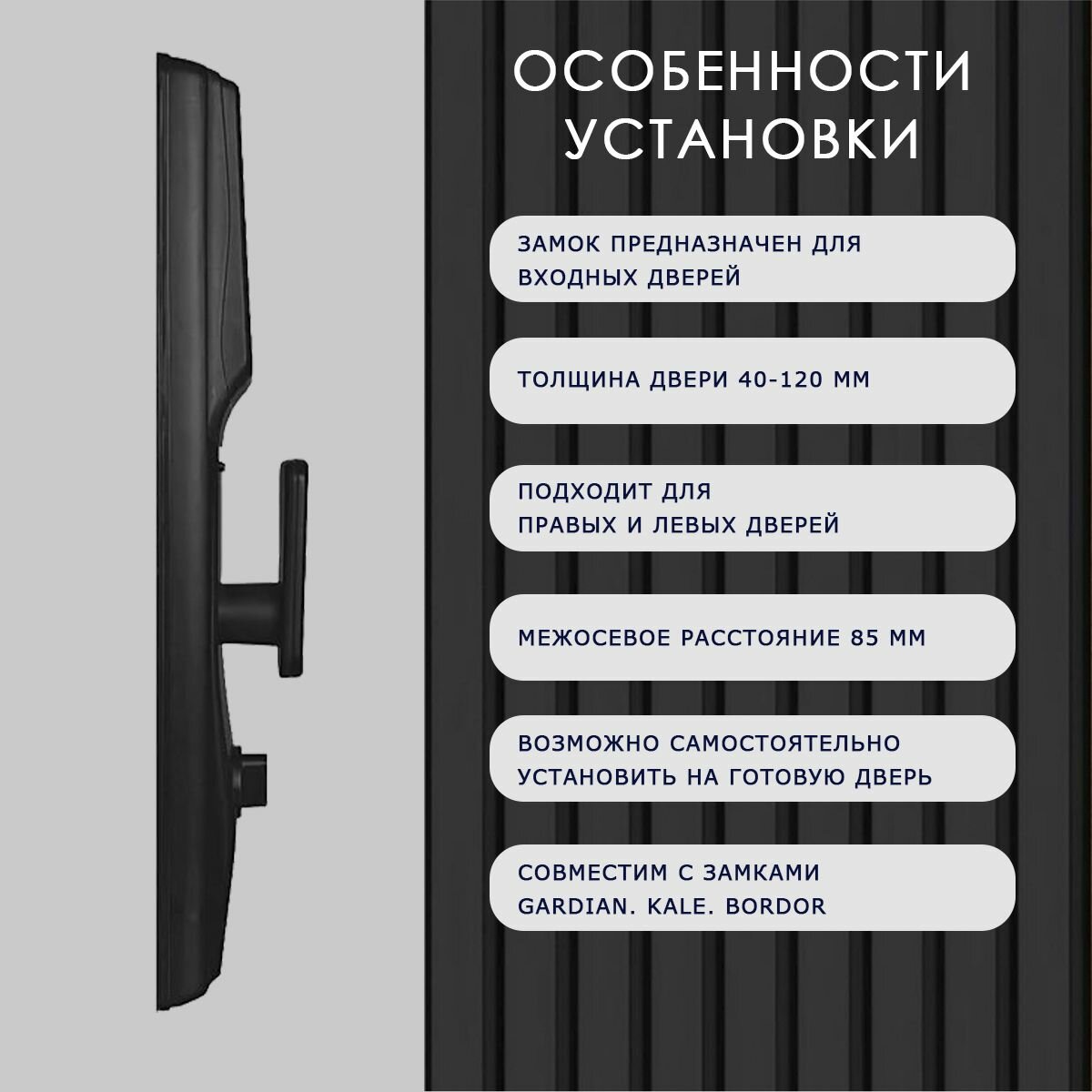 Межосевое расстояние замка 85 мм, что позволяет установить устройство на любую готовую дверь российского стандарта, в том числе на уже установленную дверь. Отлично подходит к полноценным врезным замкам Гардиан, Кале, Бордор (Gaurdian. Kale. Bordor) с межосевым расстоянием 85 мм.