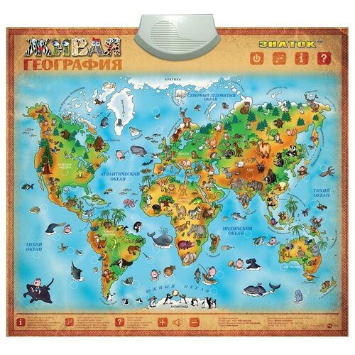 Электронный звуковой плакат «Живая география» из серии озвученных плакатов «знаток» поможет малышу узнать о нашей планете Земля и её обитателях, познакомит его с материками и океанами. С таким звуковым плакатом даже не умеющий читать ребенок самостоятельно сможет узнать много интересного и познавательного об обитателях суши и океанах. Предназначен для детей от 3 лет. На плакате есть четыре сенсорные кнопки: