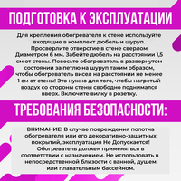 | Подробная комплектация | обогреватель, шуруп, дюбель, кольцо для фиксации обогревателя в свернутом состоянии, руководство по эксплуатации |