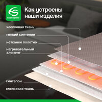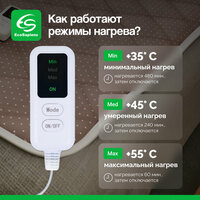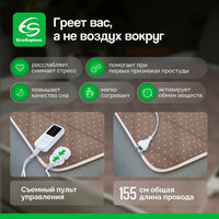 Мягкое и уютное одеяло от российского бренда EcoSapiens. Электроодеяло быстро нагревается, равномерно распределяет тепло и при этом потребляет мало электроэнергии. Изделие оснащено удобным пультом управления c 3 программами нагрева, пульт можно отсоединить и постирать электроодеяло (разрешена ручная стирка). Функция автоотключения сработает через 8, 4 и 1 час. Классическая нихромная технология прогрева. Приятный цвет изделия и универсальный размер 150х180 см позволяют использовать его в качестве электроодеяла, обычного двуспального одеяла или уютного пледа дома или на даче. Размер 150*180 см; материал - хлопок; изготовлено в России, Санкт-Петербург; гарантия 12 мес.