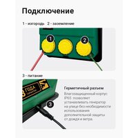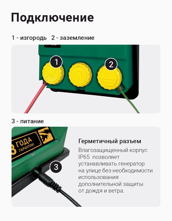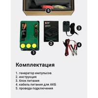 В комплекте идут инструкция в картинках и провода подключения. Рекомендуется приобрести грозозащиту и заземление, они продлят безопасный срок службы электропастуха.