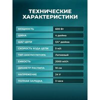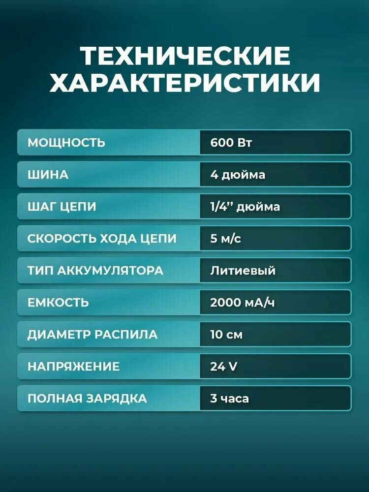 С таким садовым инструментом Вам потребуется около 10 секунд чтобы распилить бревно диаметром 15-20 см. Благодаря легкости и компактным габаритам мини пила незаменима в любом хозяйстве. Отличается маневренностью и удобством в транспортировке, является прекрасным выбором для походов. С её помощью можно легко запастись дровами для растопки бани или заготовить их на весь холодный сезон. Дизайн и эргономика разработаны для легкого и удобного использования одной рукой. Небольшой вес ( 700 г. ) делает данную модель крайне удобной. Однако несмотря на легкий вес, пила обладает мощным двигателем долгой службы, двигатель также защищен от перегрева, поскольку он автоматически отключается при превышении температуры. Простая регулировка натяжения цепи без необходимости разборки. Натяжение цепи можно легко отрегулировать с помощью винта, не разбирая саму пилу: у основания лезвия находится винт, затягивая который происходит натяжение лезвия. Одноручная пила поставляется с литиевой аккумуляторной батарей 24В. После полной зарядки пилу можно использовать в течении 2 часов. Характеристики: