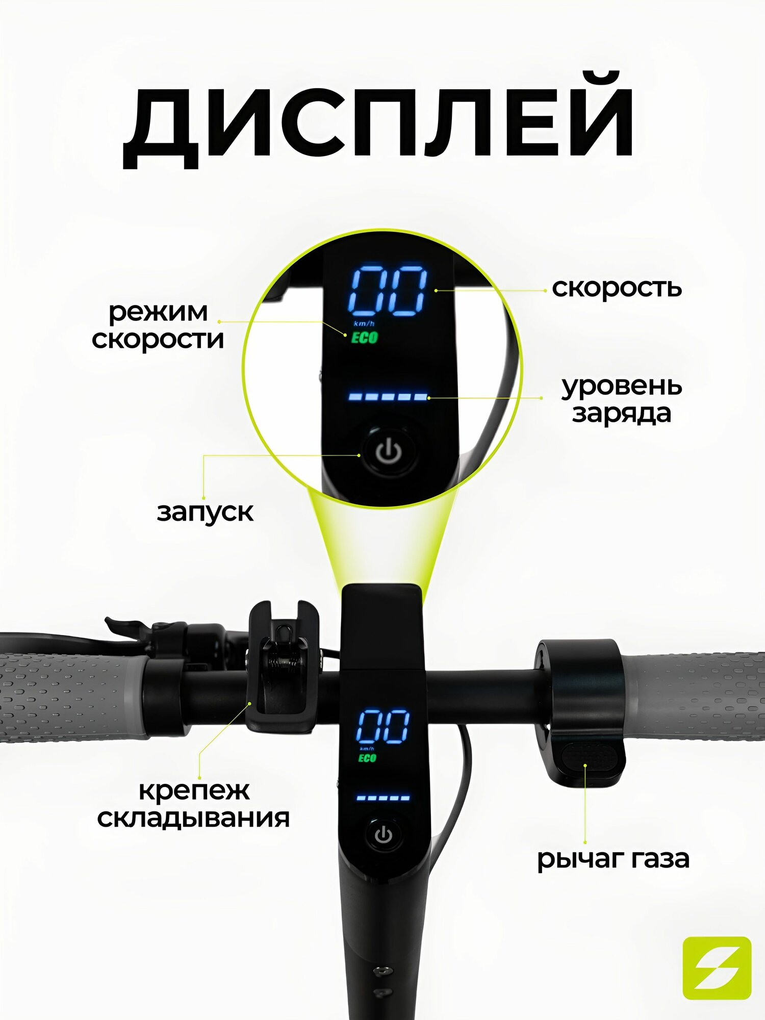 | Особенности электросамоката | дисплей, задний габарит/стоп-сигнал |