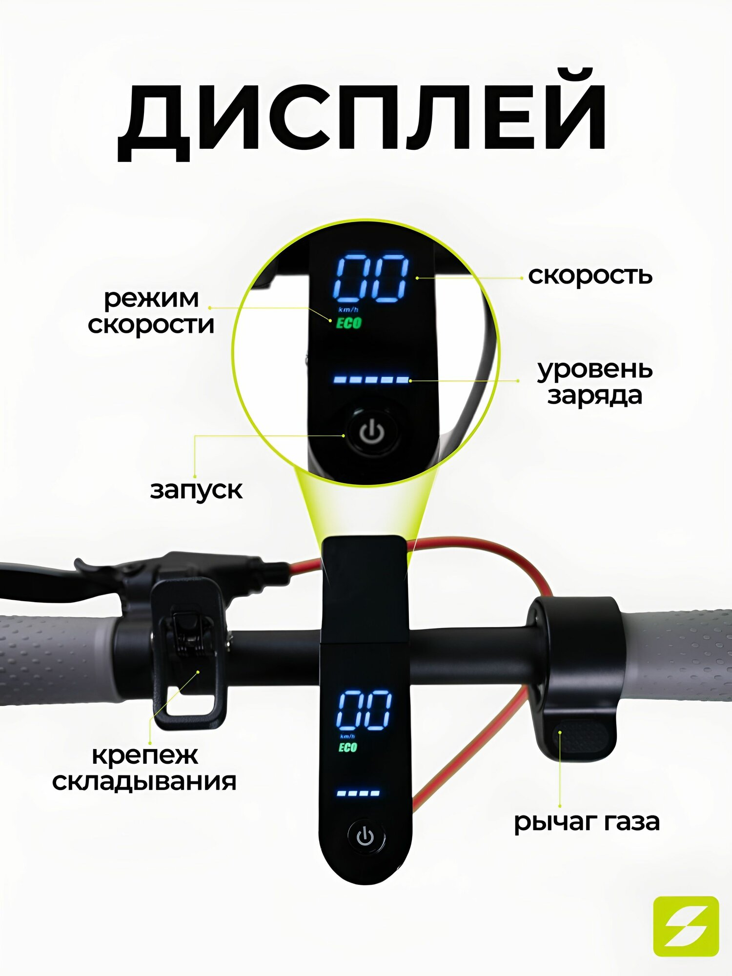 | Особенности электросамоката | дисплей, задний габарит/стоп-сигнал |
