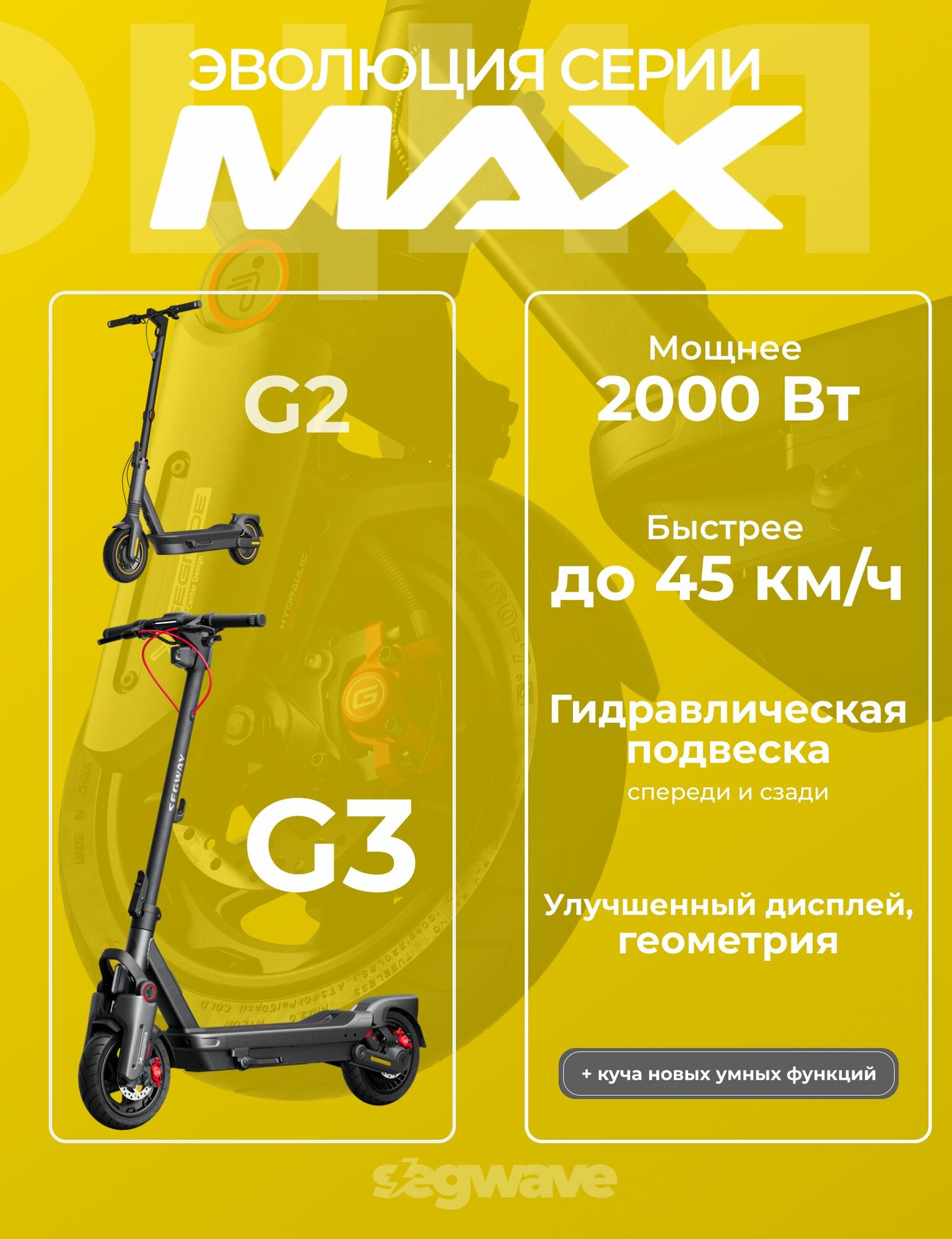 Segway MAX G3 — флагманская модель 2024 года с улучшенной скоростью, мощностью и дальностью хода. Этот электросамокат отлично подойдёт как для ежедневных поездок по городу, так и для дальних прогулок по пересечённой местности.